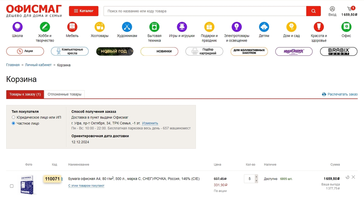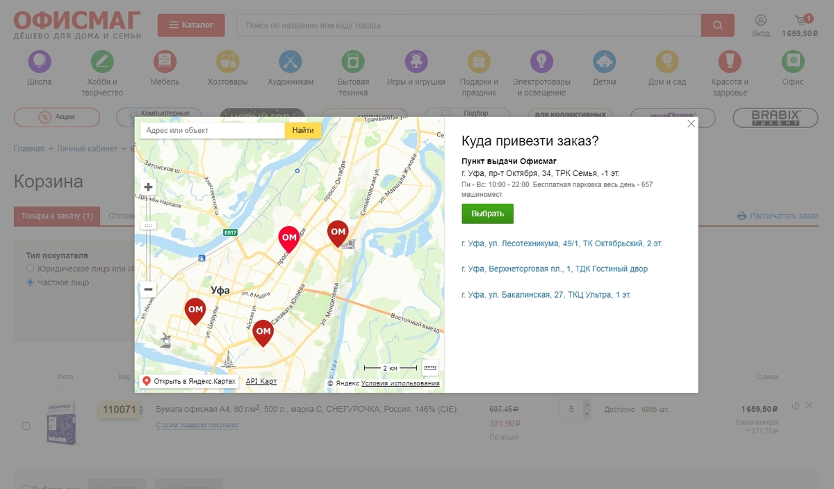 Поэтому чем меньше количество этапов при оформлении заказа, тем лучше. В идеале речь идёт о двух кликах: клик на быструю покупку и ввод минимума данных для оформления. Как это сделано на сайте «Офисмага».