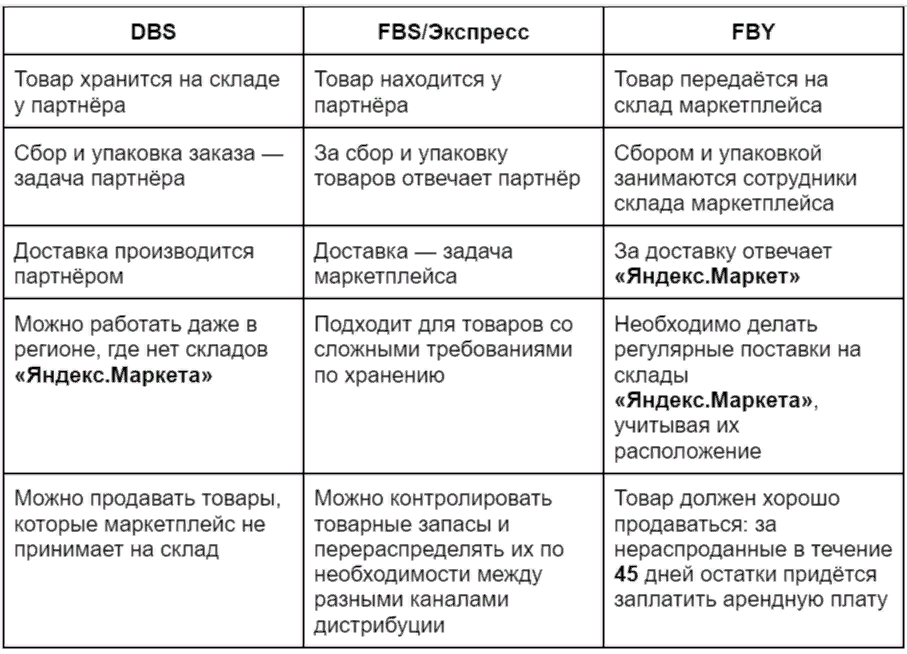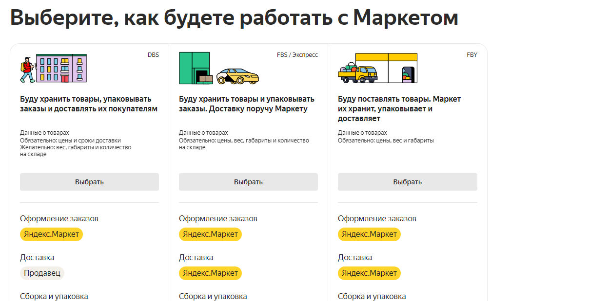 • FBS: товары передаются на сортировочные пункты партнёром или вывозятся курьерами «Яндекс.Маркета»; нужно строго придерживаться всех правил упаковки.