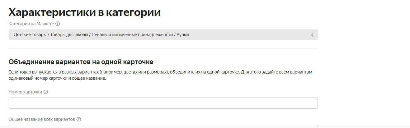 Теперь придётся заполнить вкладку «Характеристики в категории». Для начала предлагается объединить похожие товары в одну карточку (например, несколько ручек одной модели, но с разными цветами чернил). Для этого вписываем номер карточек и общее название для них.