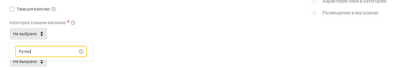 Указываем категорию товара. В уже работающем магазине будут предлагаться уже имеющиеся категории. Если их нет, вписываем и нажимаем Enter.