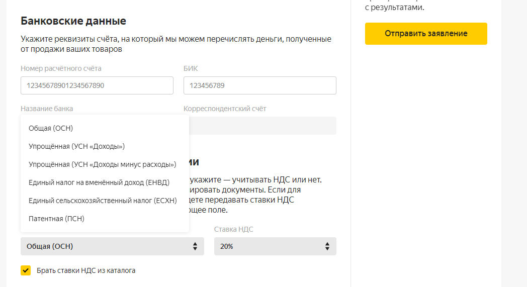 Далее вводятся банковские данные и выбирается система налогообложения (на скриншоте видны все варианты). От последней зависит, как будет считаться НДС.