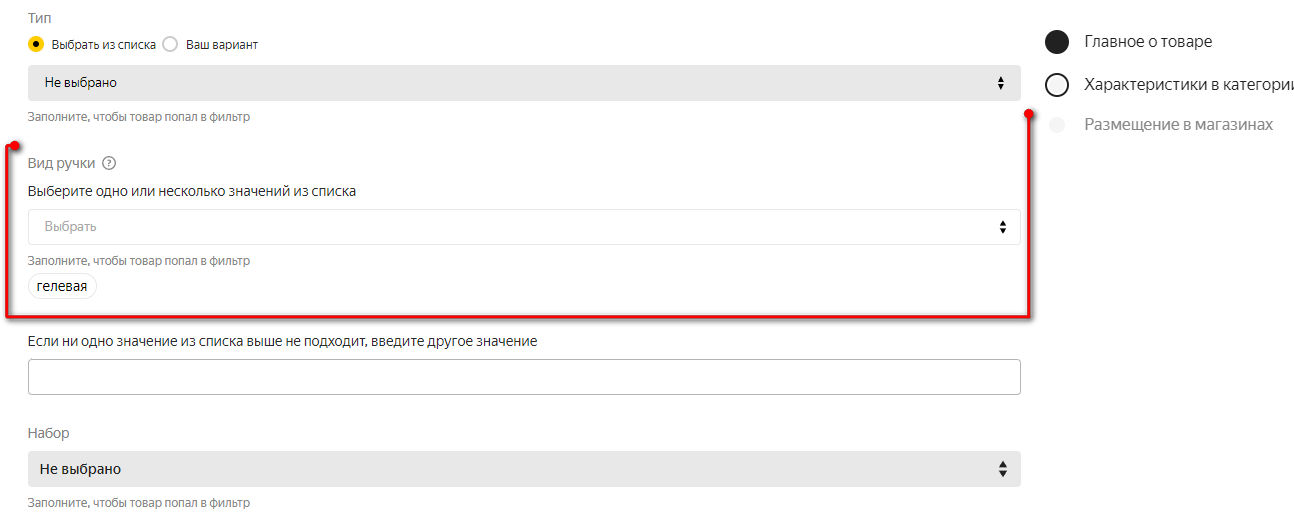 Указываем вид и тип товара. Причём вид можно выбрать из списка, который опирается на указанные в предыдущих шагах характеристики.