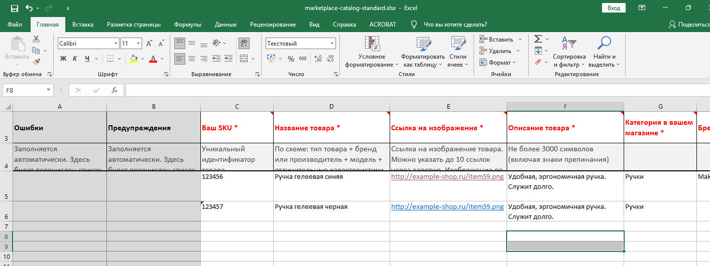 На скриншоте ниже видно, как выглядит шаблон. В нём уже есть заполненная строка, демонстрирующая, как правильно вносить данные в таблицу. Меняем её на свой товар. Вносим в шаблон всю информацию.
