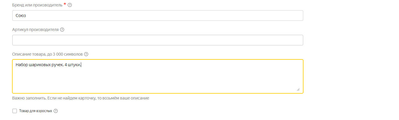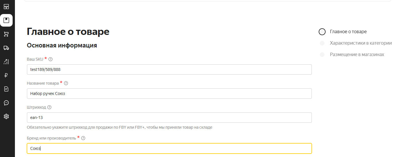 Открывается форма. Все помеченные звёздочкой пункты обязательны для заполнения. Вписываем название товара и SKU (последний пункт будет использоваться в качестве дополнительного идентификатора), имя бренда.