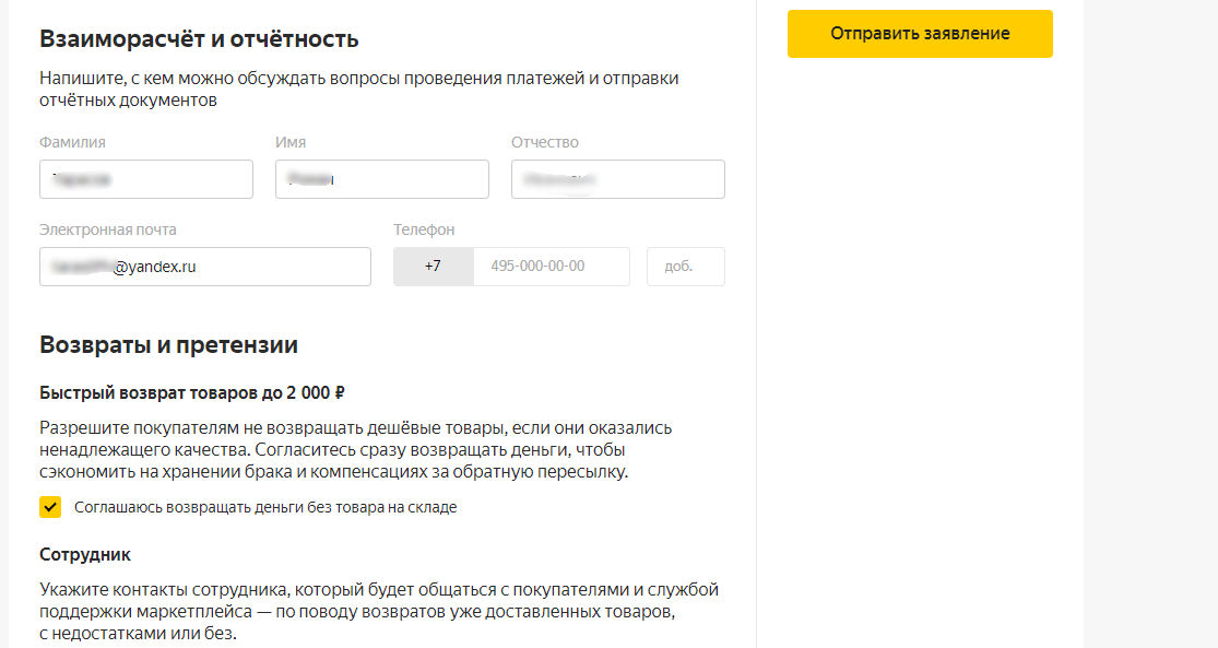 Указываем информацию о сотруднике, с которым маркетплейс будет взаимодействовать по вопросам отчётности и расчётов. В некоторых случаях имеет смысл разрешить покупателям оставлять у себя бракованные товары. Тут лучше посчитать, сколько будет стоить возврат товара на склад, и выбрать подходящий вариант.