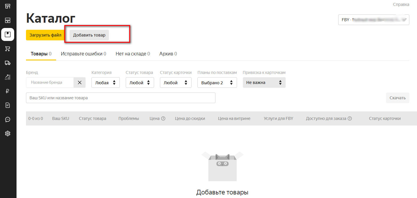 В личном кабинете переходим в «Каталог» (в меню слева) и нажимаем кнопку «Добавить товар».