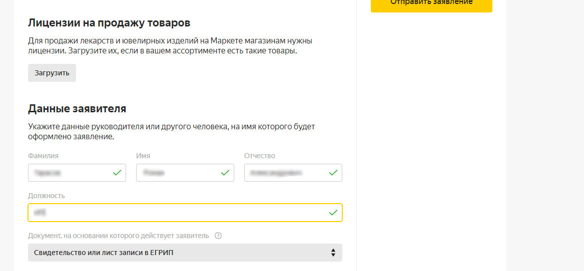 Для лицензируемых товаров требуется загрузить лицензии (для канцтоваров это не нужно). Вписываем данные заявителя и его должность.