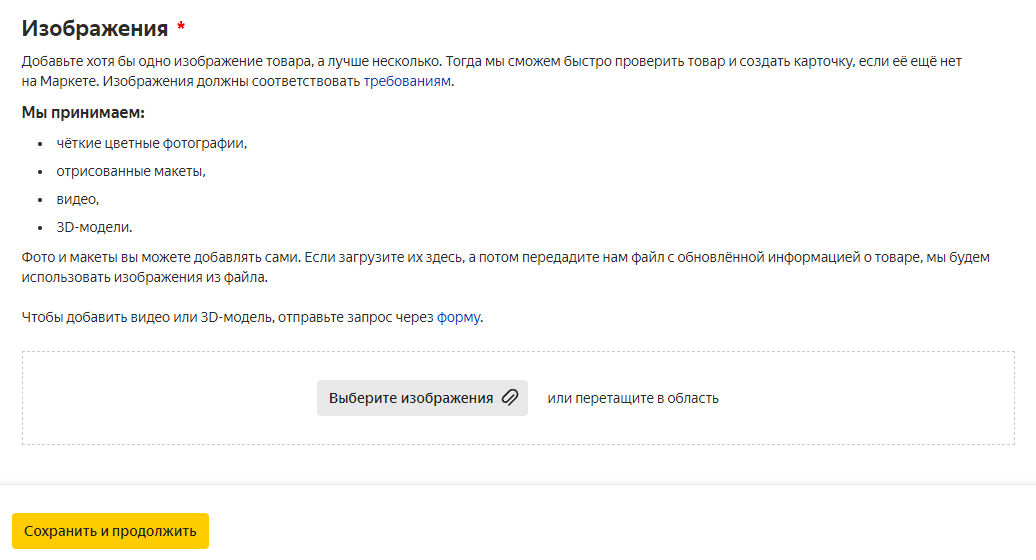 Добавляем изображения товара (столько, сколько нужно для его полноценной презентации). Фото можно загружать только в формате .jpg. Нажимаем кнопку «Сохранить и продолжить».