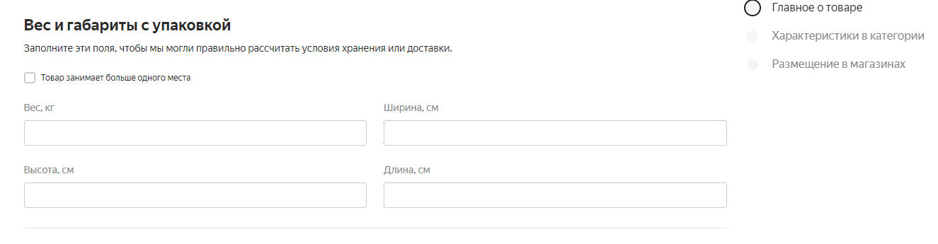 Вносим весогабаритные характеристики товара (здесь нужно учитывать ещё и упаковку).