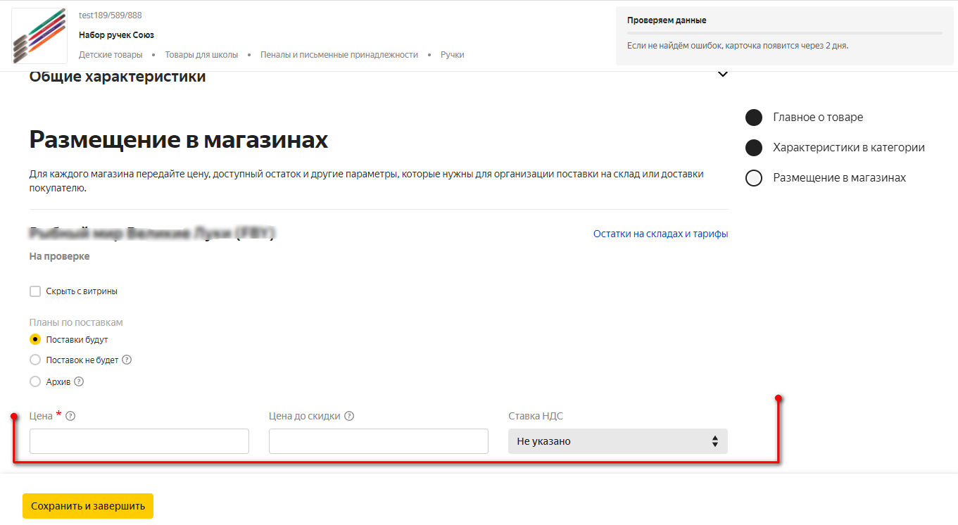 Остаётся лишь указать, в каких магазинах продаётся ваш товар (в моём случае это один, но у вас может быть несколько разных магазинов в рамках маркетплейса). Выбираем тот, который сейчас заполняем. Указываем цену, а также стоимость до скидки, если это необходимо. Жмём «Сохранить и завершить».