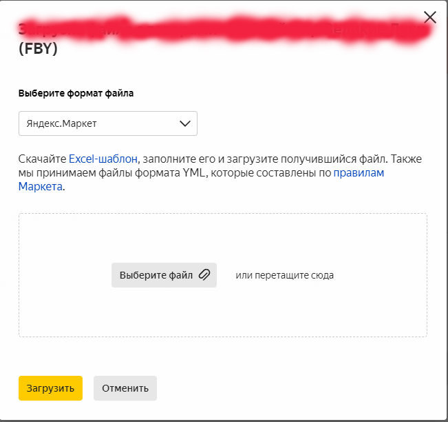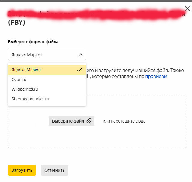 Открывается форма, предлагающая выбрать формат файла (если вы уже торгуете на Ozon, возьмите подготовленный для них документ и загрузите). Мы же выберем формат «Яндекс.Маркет», чтобы посмотреть, как его заполнить.