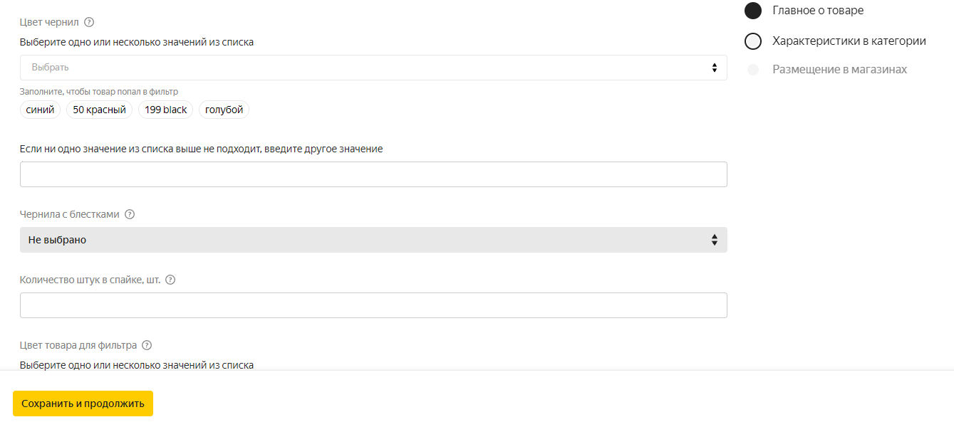 Указываем число единиц в упаковке, дополнительные характеристики, если они имеются для вашей группы товаров (для моих ручек система предложила выбрать «Чернила с блёстками»). После чего по традиции кликаем «Сохранить и продолжить».