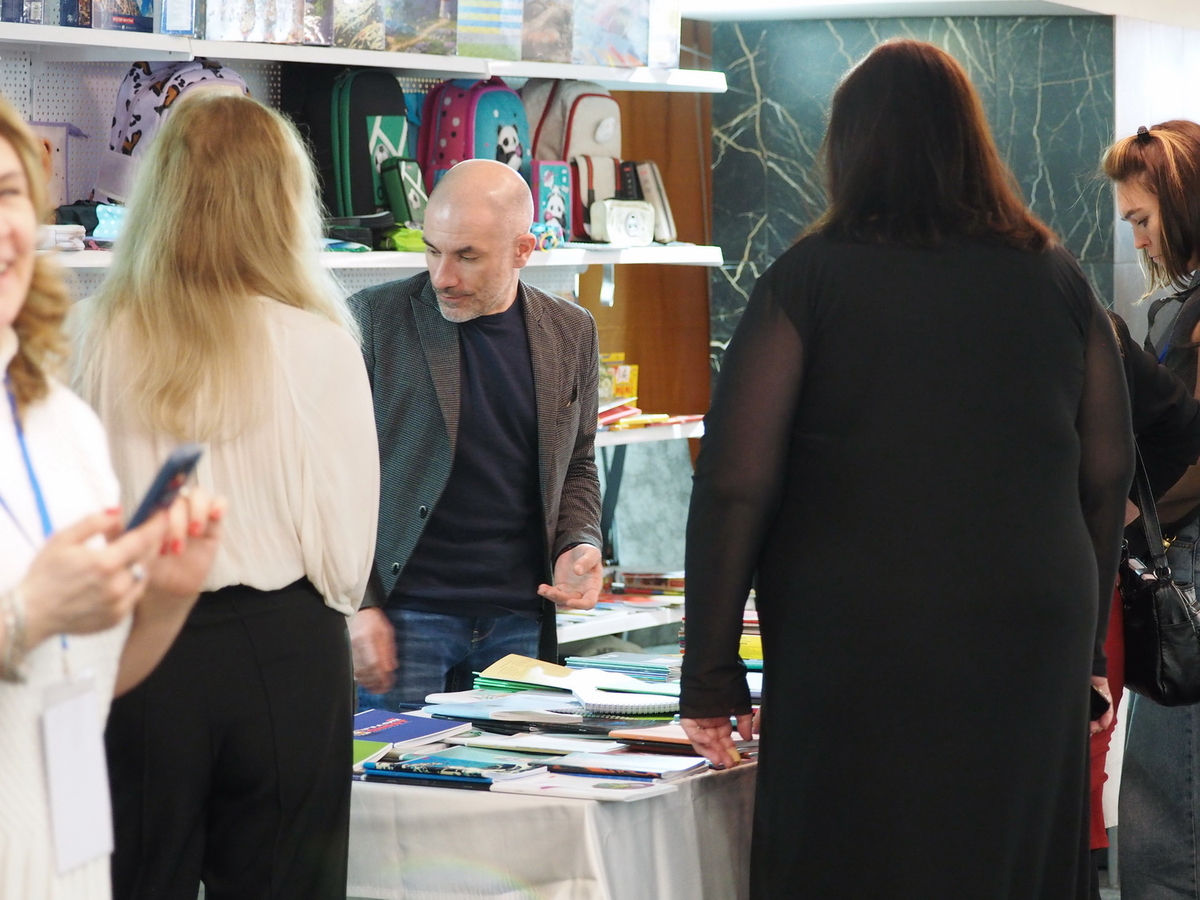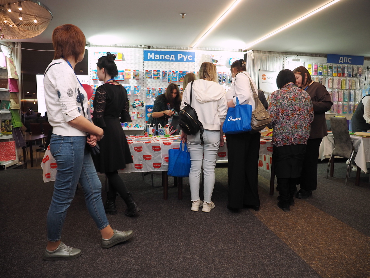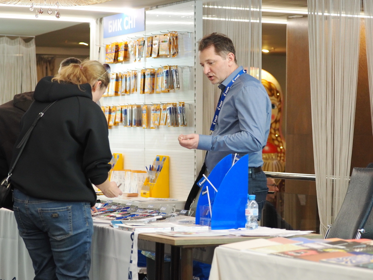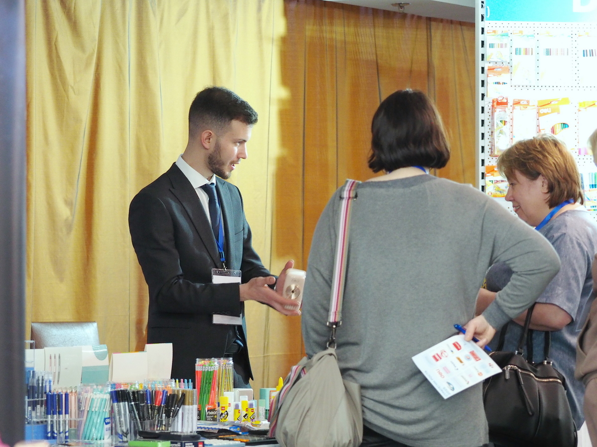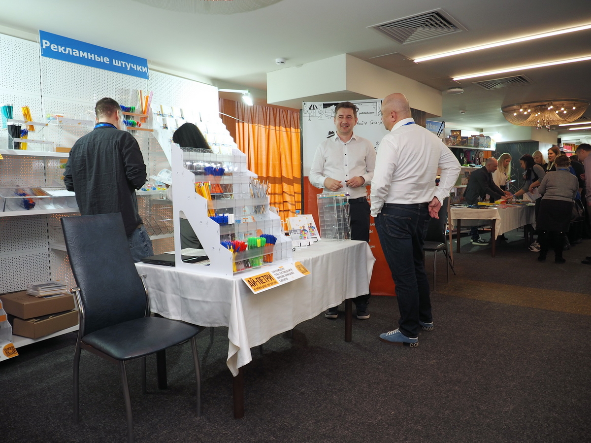 Люди, стенды, канцтовары, переговоры и беседы замершие на снимках