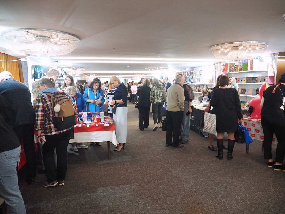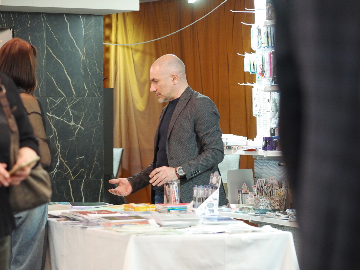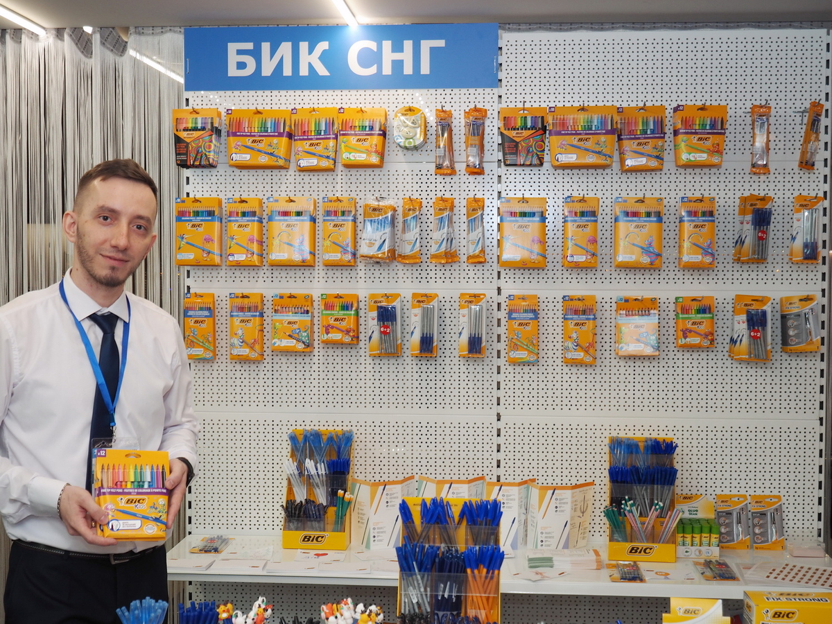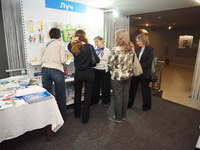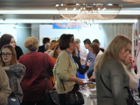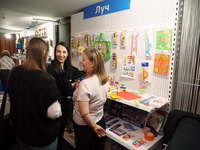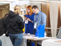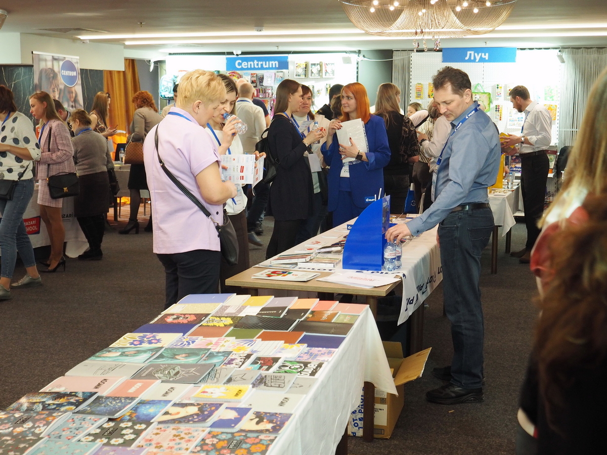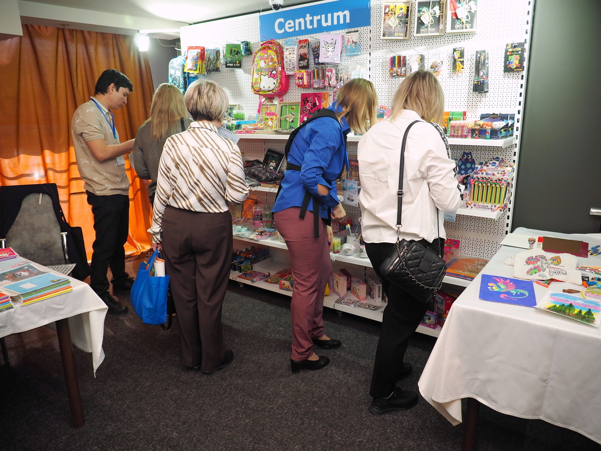 Люди, стенды, канцтовары, переговоры и беседы замершие на снимках
