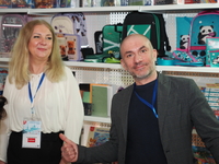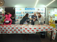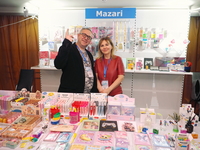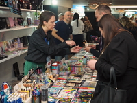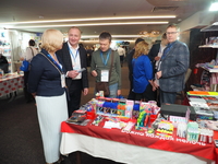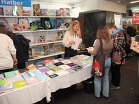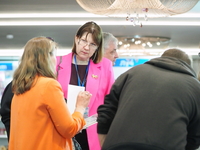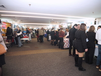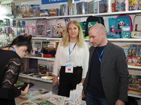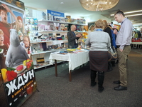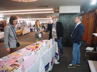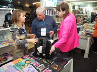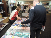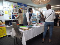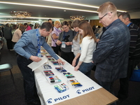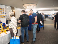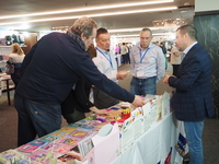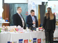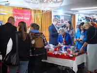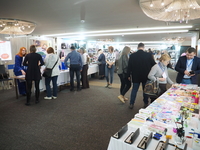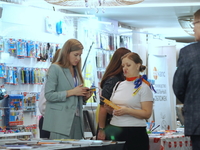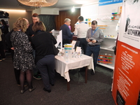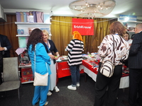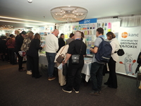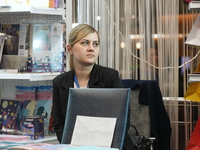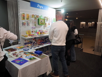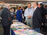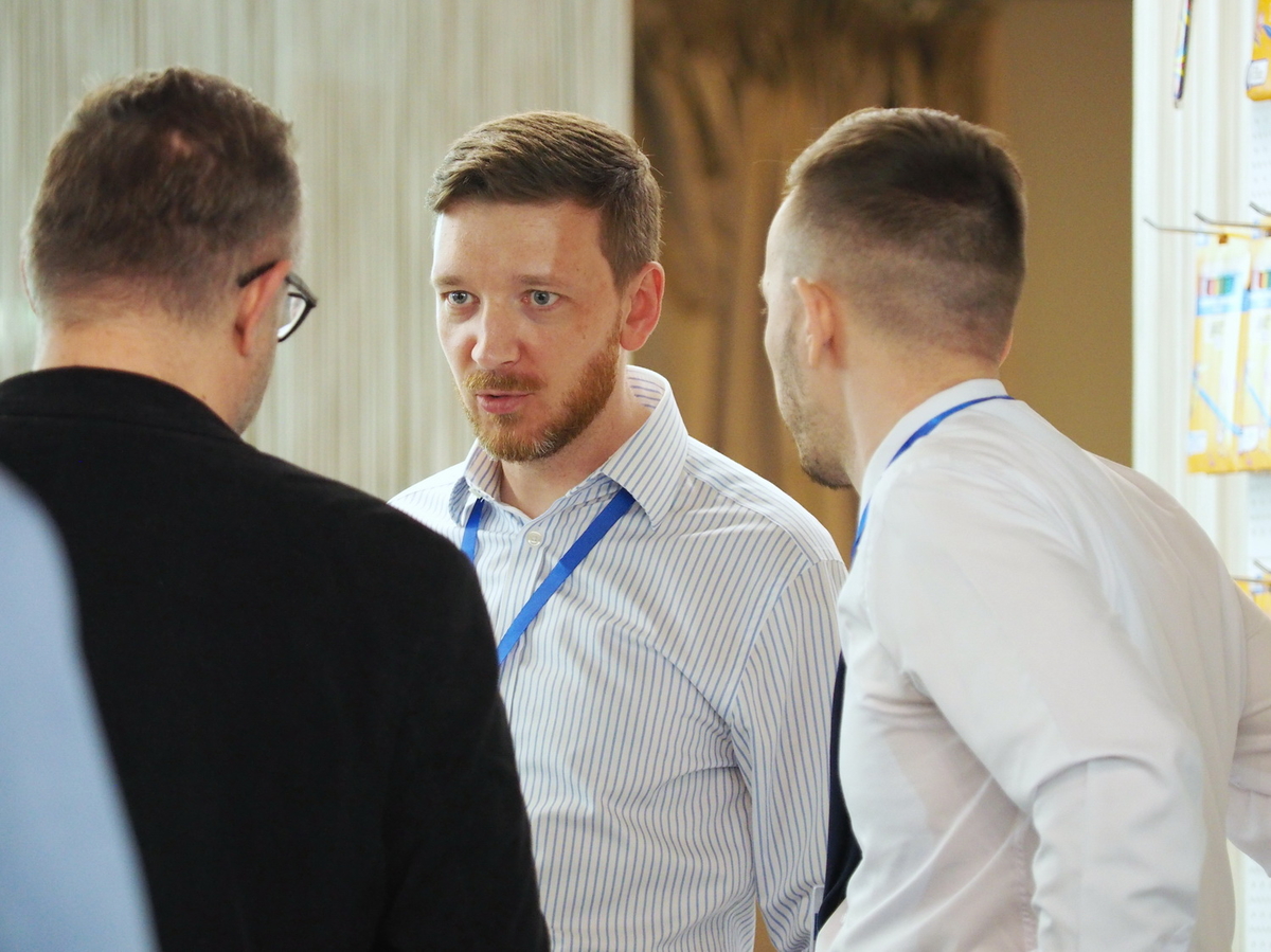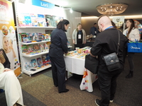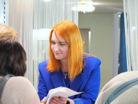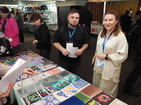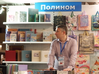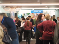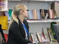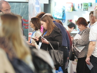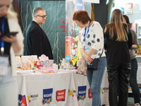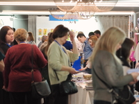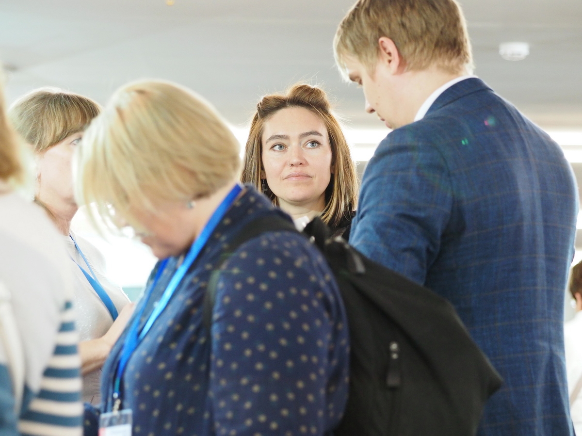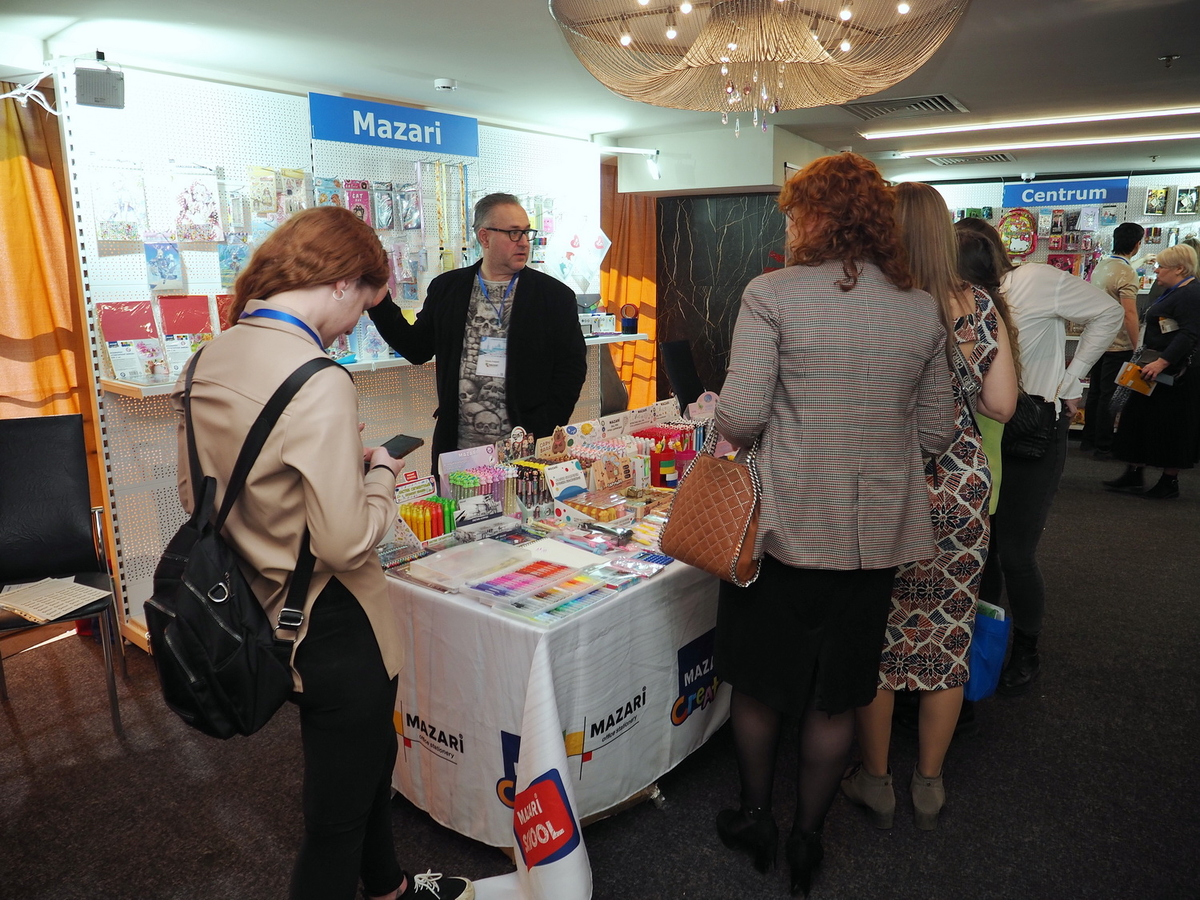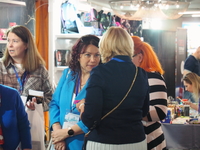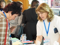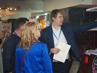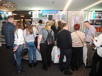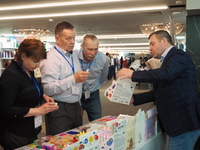 Люди, стенды, канцтовары, переговоры и беседы замершие на снимках