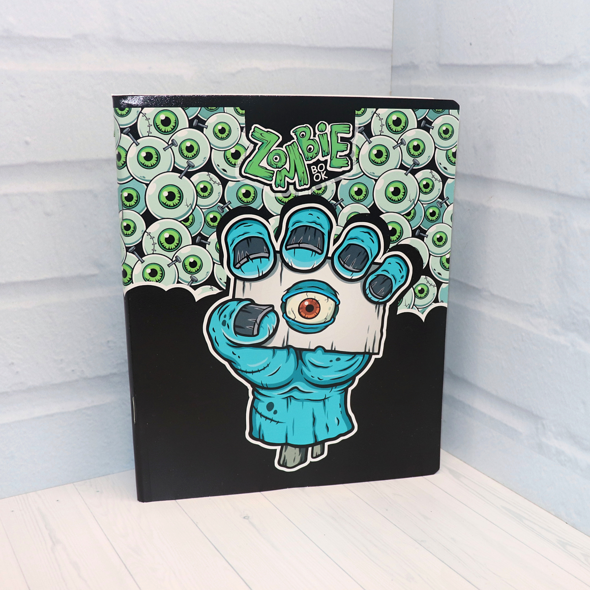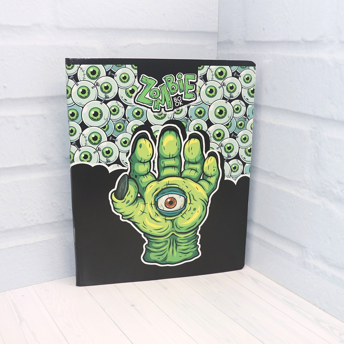 Обложка тетради «ЗомбиБук» выполнена с применением твин-лака, что придаёт ей особый вид. Внутренний блок изготовлен из офсетной бумаги с плотностью 60 г/кв. м.