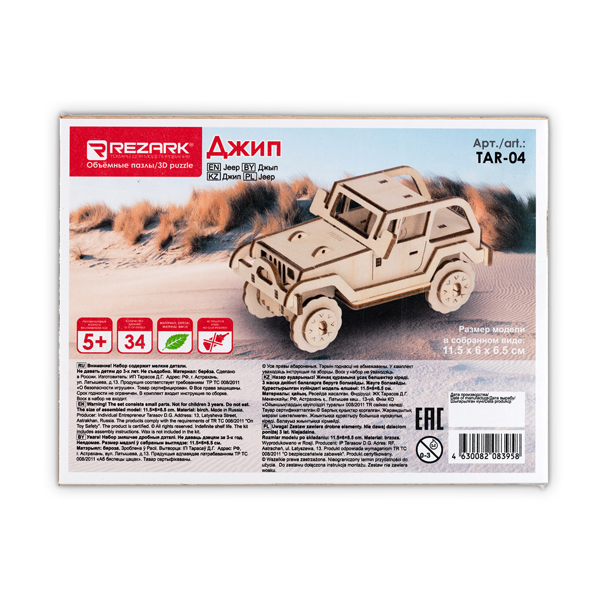 ТМ REZARK предлагает поближе познакомиться с этим невероятно мощным и по-настоящему легендарным автомобилем, собрав 3D-модель «Джип» (арт. TAR-04). Набор содержит понятную пошаговую инструкцию и имеет прочную упаковку. Такая игрушка будет хорошим подарком для детей от пяти лет, ведь детали легко фиксируются без клея, а некоторые подвижны!