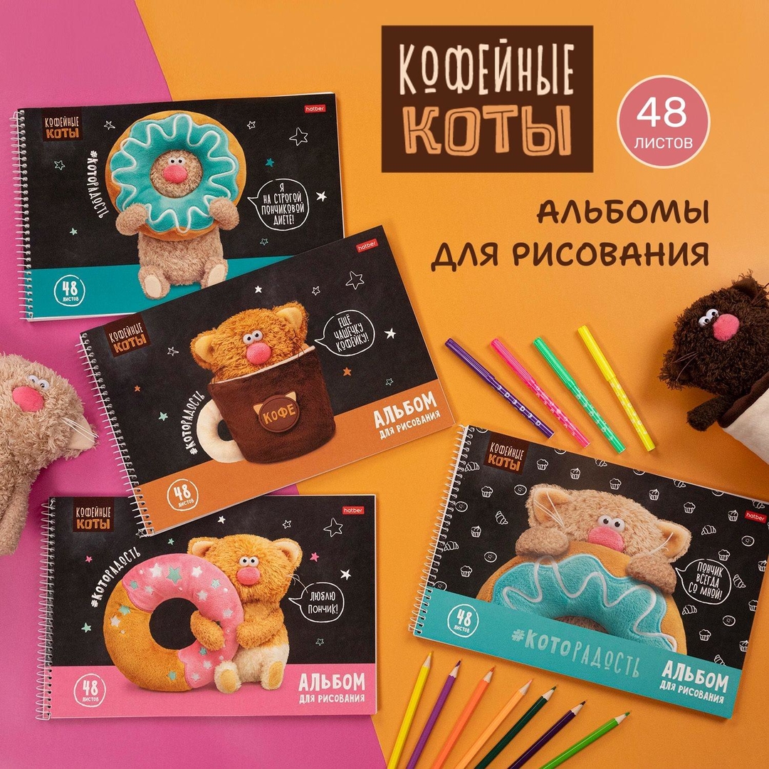 «Кофейные коты». Альбомы для рисования от Hatber в коллаборации с мягкими игрушками «БУДИ БАСА»