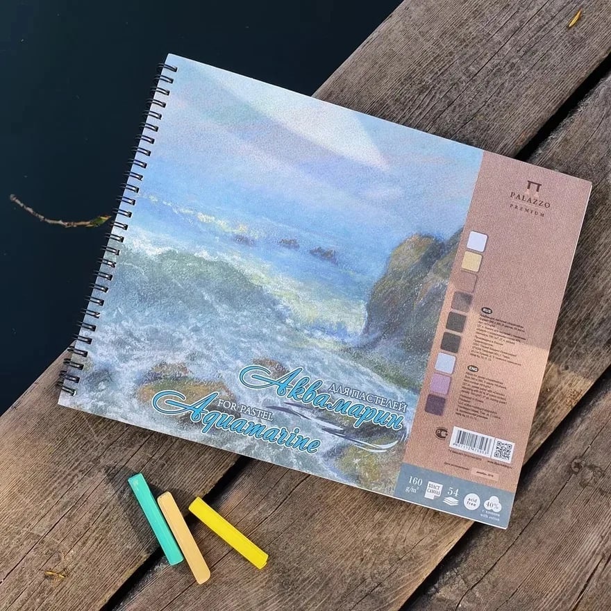 Альбом для пастели «Аквамарин» содержит 54 листа, из которых 27 листов тонированной бумаги с тиснением «холст» (с одной стороны) и 27 листов кальки для защиты готовых работ. В альбоме 9 цветов по 3 листа каждого оттенка: белый лёд, песочный, бежевый, пепельный, серый, граунд, голубой, лаванда, ежевичный.