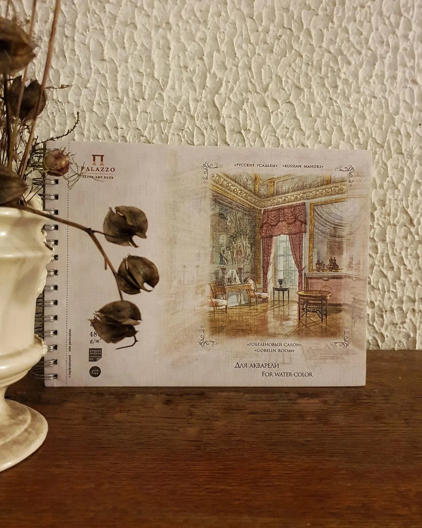 Альбом на пружине «Гобеленовый салон» из серии «Русские усадьбы» имеет формат 208*280 мм. Внутренний блок состоит из восьми листов бумаги натурального белого цвета, она устойчива к старению и не содержит кислот.