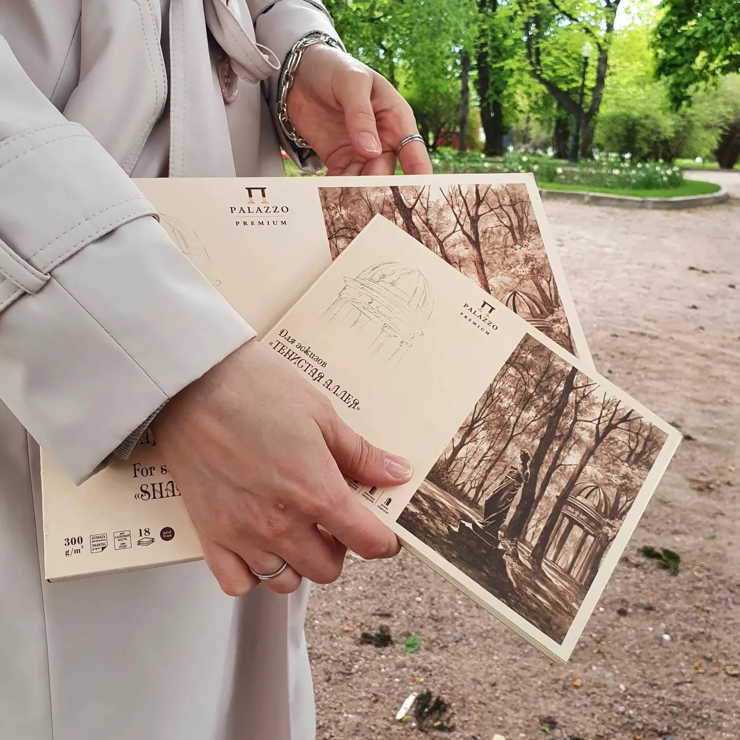 Сейчас самое время ходить на пленэр. Альбом с тонированной бумагой «Тенистая аллея» прекрасно дополнит творческий подход к работе. Планшет состоит из 18 листов плотной бумаги (300 г/кв. м) цвета слоновой кости. С одной стороны проклеен по корешку, имеет основание из жёсткого картона. Представлен в нескольких форматах, и, конечно, же есть маленький формат А5, который удобно брать с собой на пленэр.