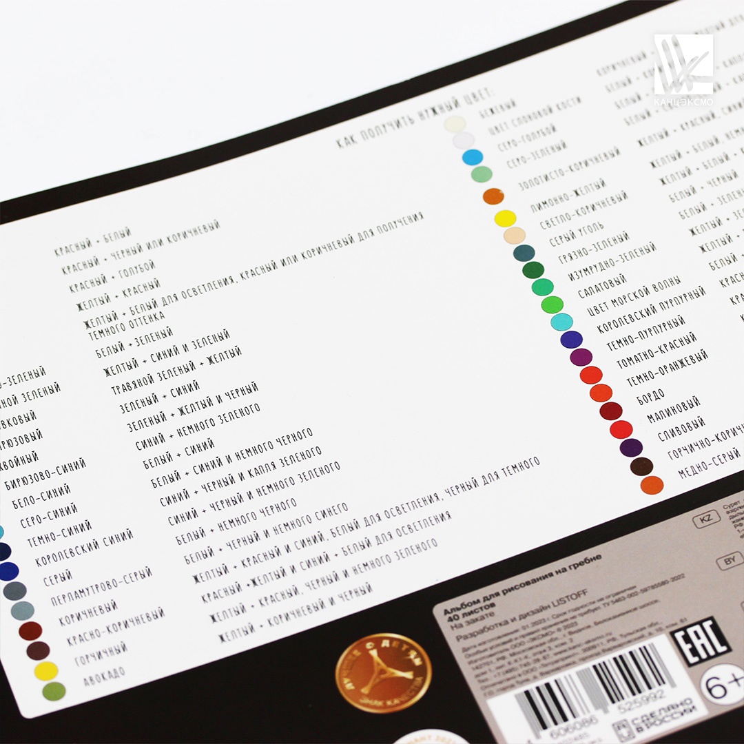 Альбом для рисования на гребне от Listoff с уроками скетчинга для тех, кто хочет научиться этой модной технике. Комбинация классического альбома для рисования с контентом: таблица по смешиванию цветов, пошаговые уроки скетчинга.