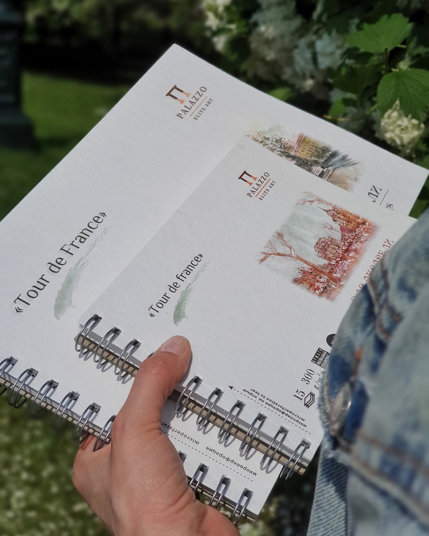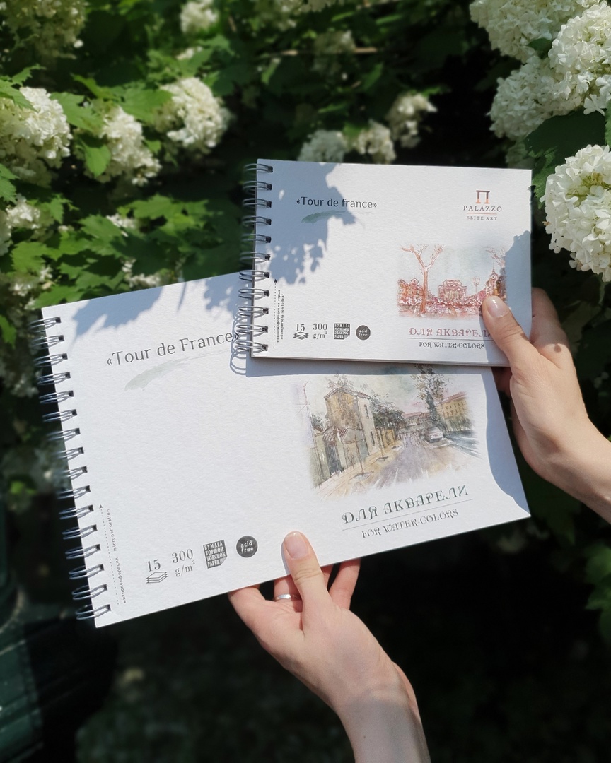 Альбомы для акварели Tour de France выпускаются на пружине, основание из жёсткого картона для удобства рисования, листы имеют микроперфорацию. Подойдёт бумага для работы различными водорастворимыми красками.
