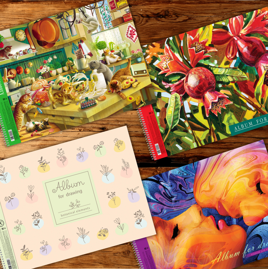 Всем этим творческим порывам отвечают наши новинки – альбомы для рисования «Рубиновый гранат», «Поцелуй», «Котики бывают разными» и «Ботаника». Яркие обложки обязательно придутся вам по душе!