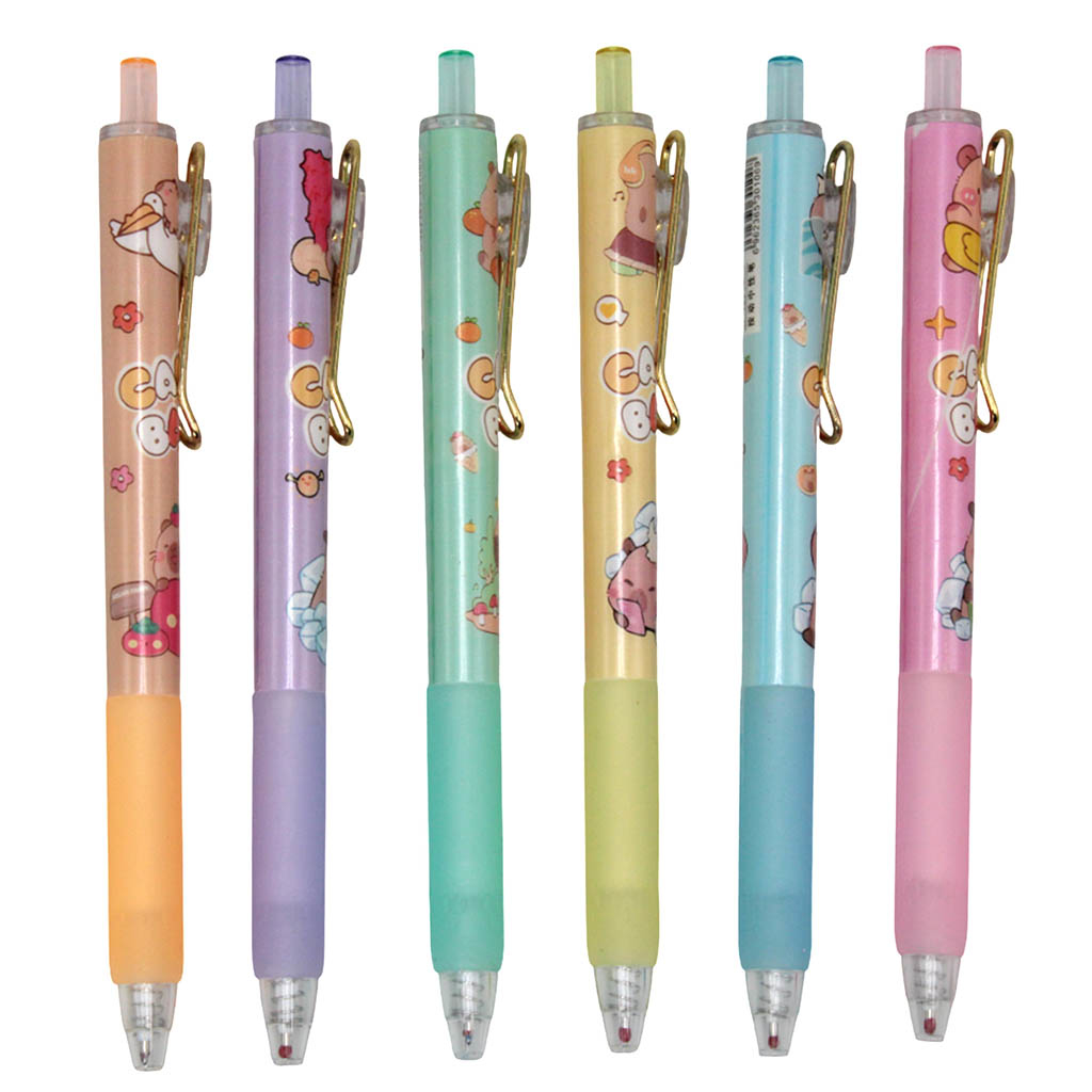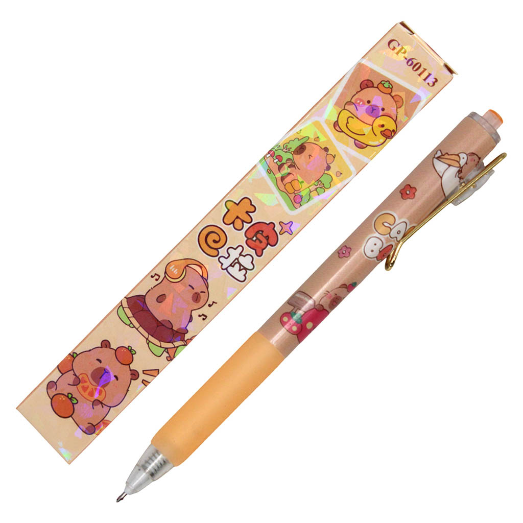 Утолщённый пластиковый корпус. Автоматический нажимной механизм обеспечивает плавную подачу стержня. Полноцветная печать рисунка. Ароматизированные чернила. Диаметр пишущего узла — 0,5 мм. Цвет чернил — синий. Упаковка — фирменный картонный стенд.