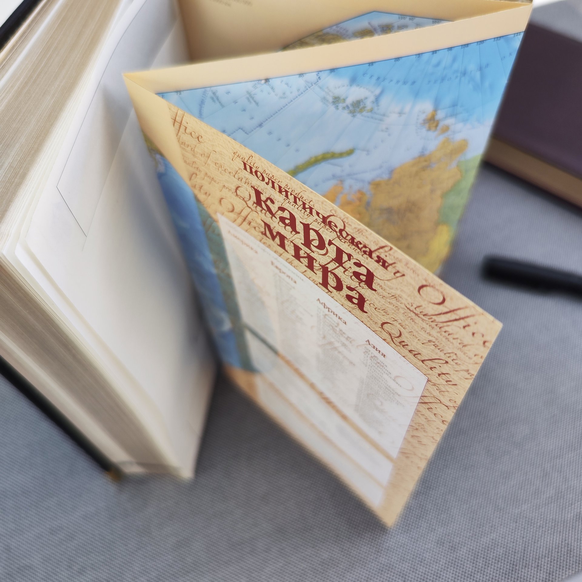 Ежедневник универсального формата имеет удобно организованный полудатированный блок. Две страницы отведены под заметки. Также присутствует страница для персональных данных и справочная информация. Ежедневник дополнен полноцветной вклейкой с географической картой. Две закладки-ляссе бордового цвета помогут быстро ориентироваться в записях.