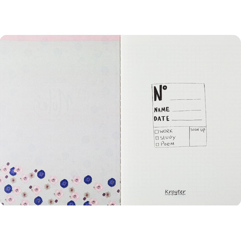 Отдельно рассмотрим бизнес-тетрадь Kroyter Flowers в ярком дизайне. Она имеет мягкую обложку из картона с цветочным принтом, тонированный блок из офсетной бумаги плотностью 70 г/кв. м (белизна 76 %). Здесь уже 40 листов в клетку. У изделия нет ляссе, разделителей и дополнительных элементов.