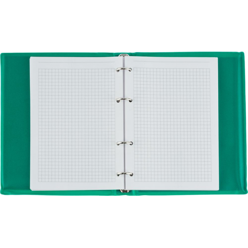 Бизнес-тетрадь на кольцах Attache А5-формата изготовлена из переплётного картона толщиной 1,5 мм, обтянутого ПВХ-плёнкой зелёного цвета. Тиснение фольгой логотипа Attache, кольцевой механизм на 4 кольца, блок сделан из офсета 60 г/м белого цвета, линовка клетка, 160 листов. Есть возможность нанесения логотипа, тиснения. Диаметр колец позволяет увеличить количество листов на одну тетрадь. Размер блока — 165х215 мм.