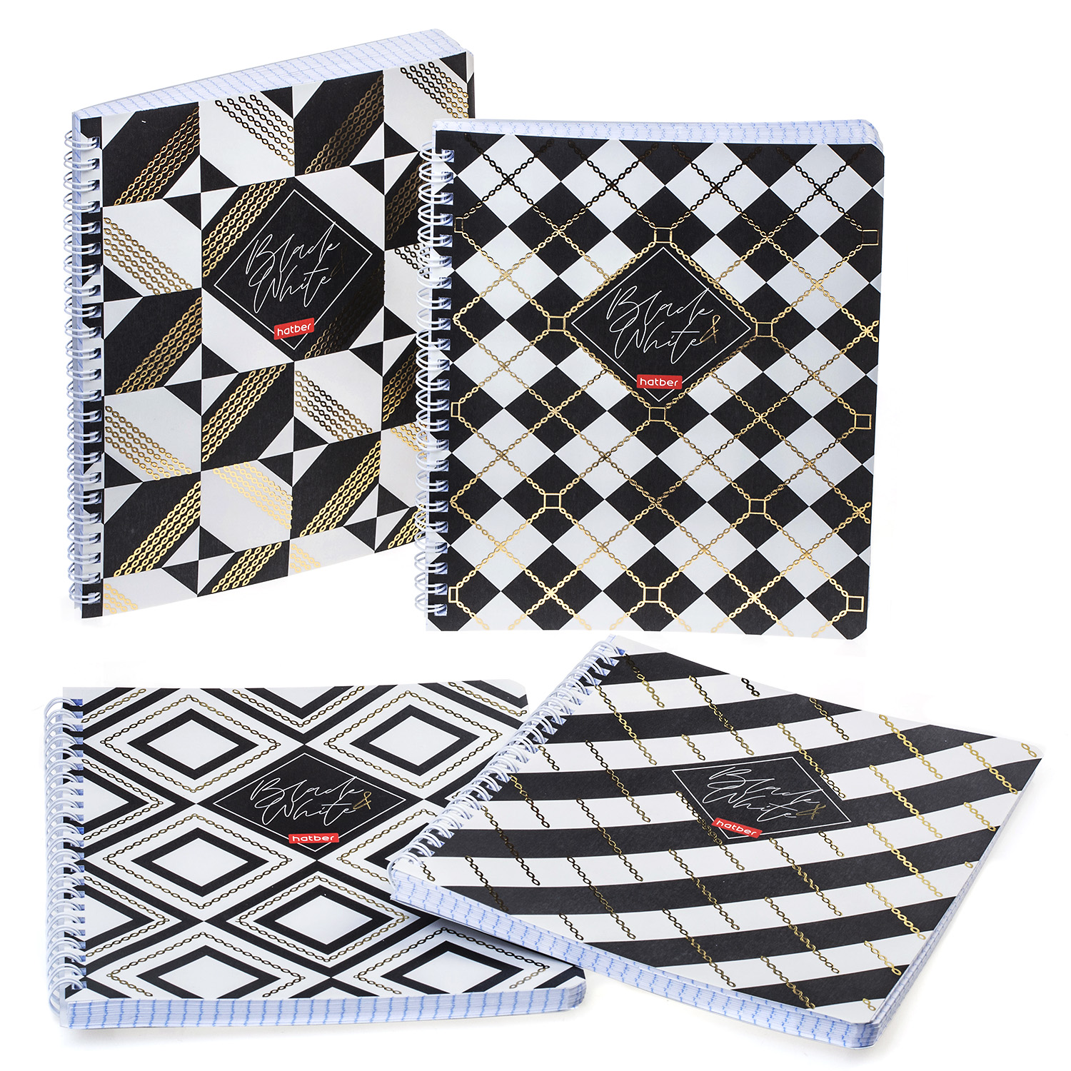 Представляем вам новые тетради А5-формата 96 листов на гребне в клетку серии Black&White. Новинка представлена в четырёх дизайнах. Изысканный паттерн со сверкающей золотой 3D-фольгой, современный микс винтажного и викторианского стиля, совершенно новый уровень элегантности. Такие тетради станут заметным акцентом на полке, привлекут к себе внимание и порадуют покупателя традиционным качеством от компании HATBER.