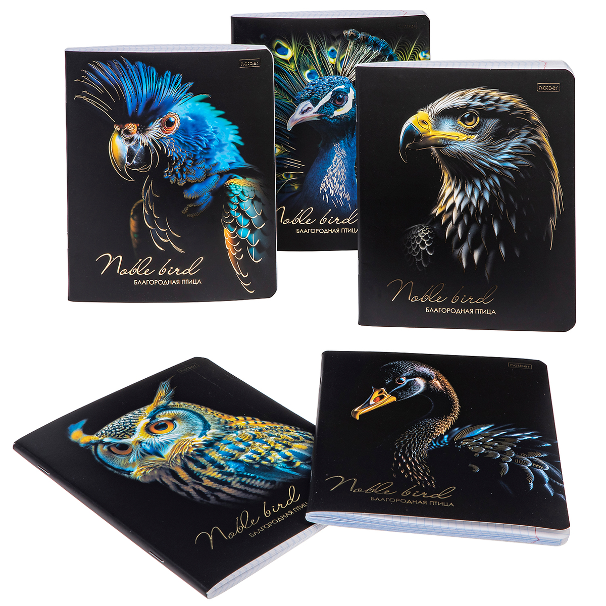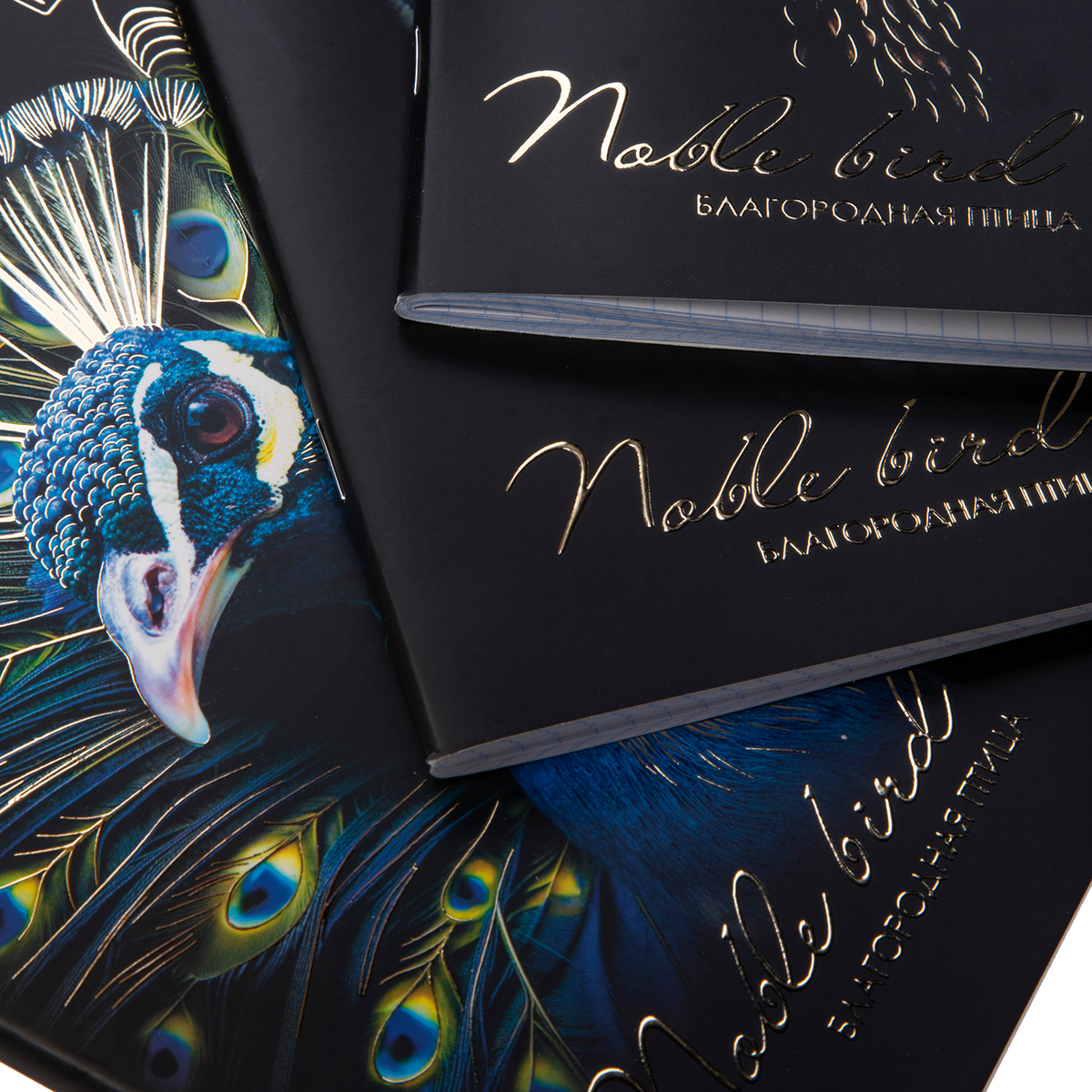 Представляем вам наши новые тетради А5-формата 48 листов на скобе в клетку серии «Благородные птицы». Уникальность каждой из них подчёркнута чёрным матовым фоном обложки, который великолепно сопрягается с разнообразием цветов изысканного оперения птиц. Финишная отделка деталей золотой 3D-фольгой добавляет нотки роскоши, что прекрасно подчёркивает драгоценный окрас. Величественные и непредсказуемые, поистине благородные создания, они навсегда западают в сердца людей.