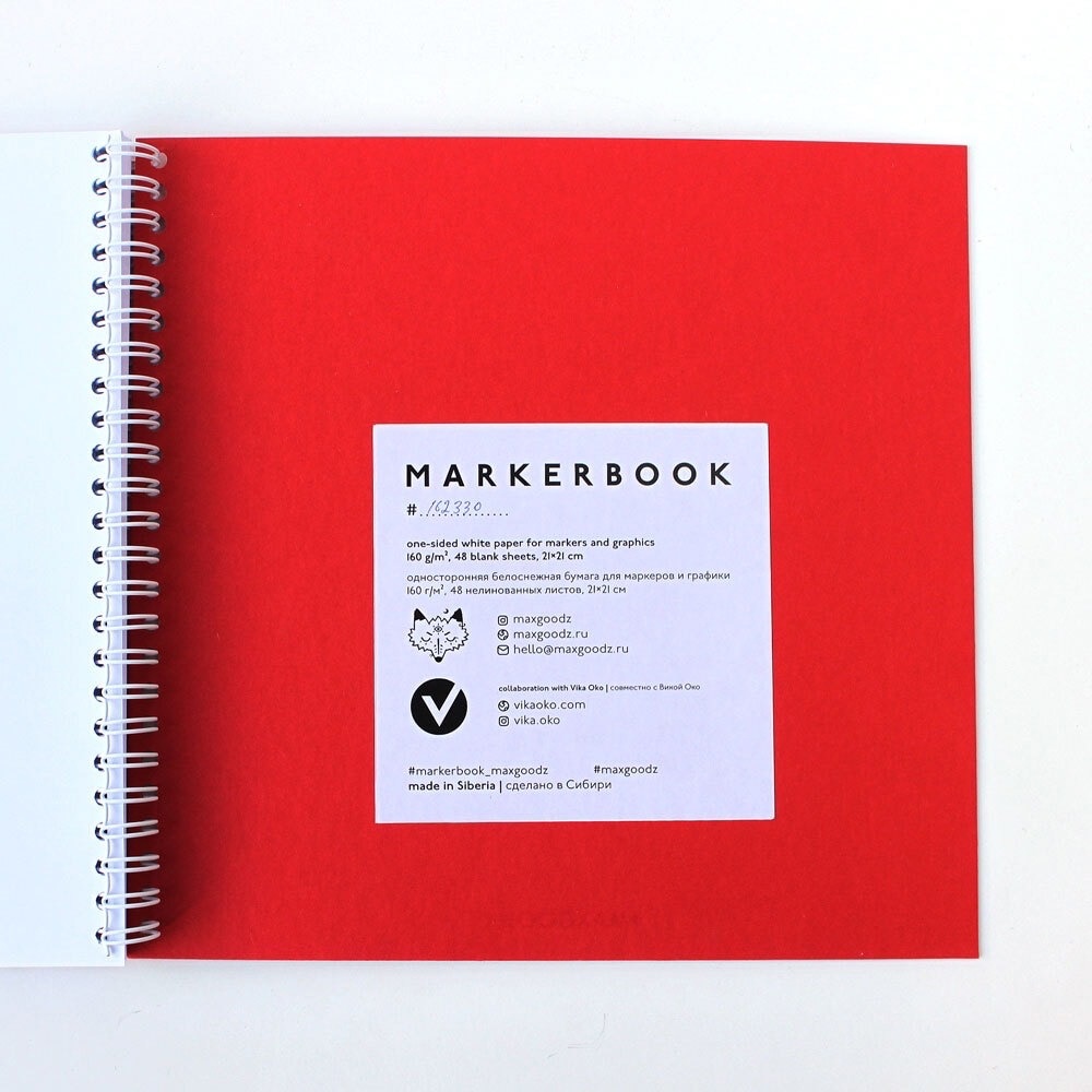 Маркербук Maxgoodz — это скетчбук в твёрдом переплёте на пружинке размера 21*21 см. Внутри 48 листов белоснежной австрийской односторонней бумаги для маркеров плотностью 160 г/кв. м.