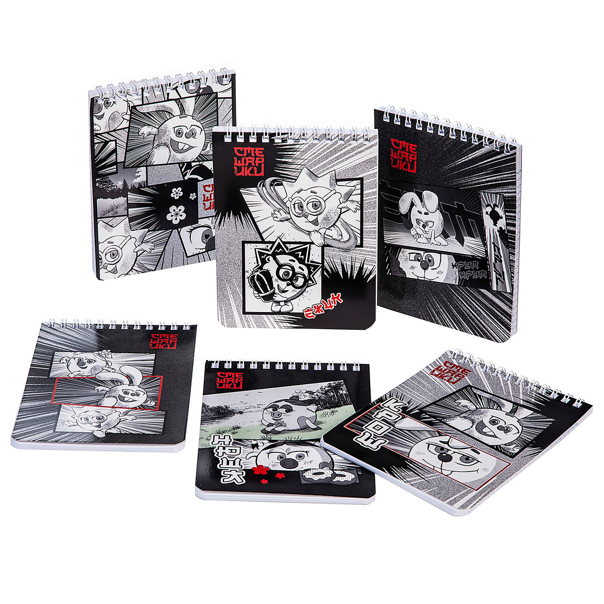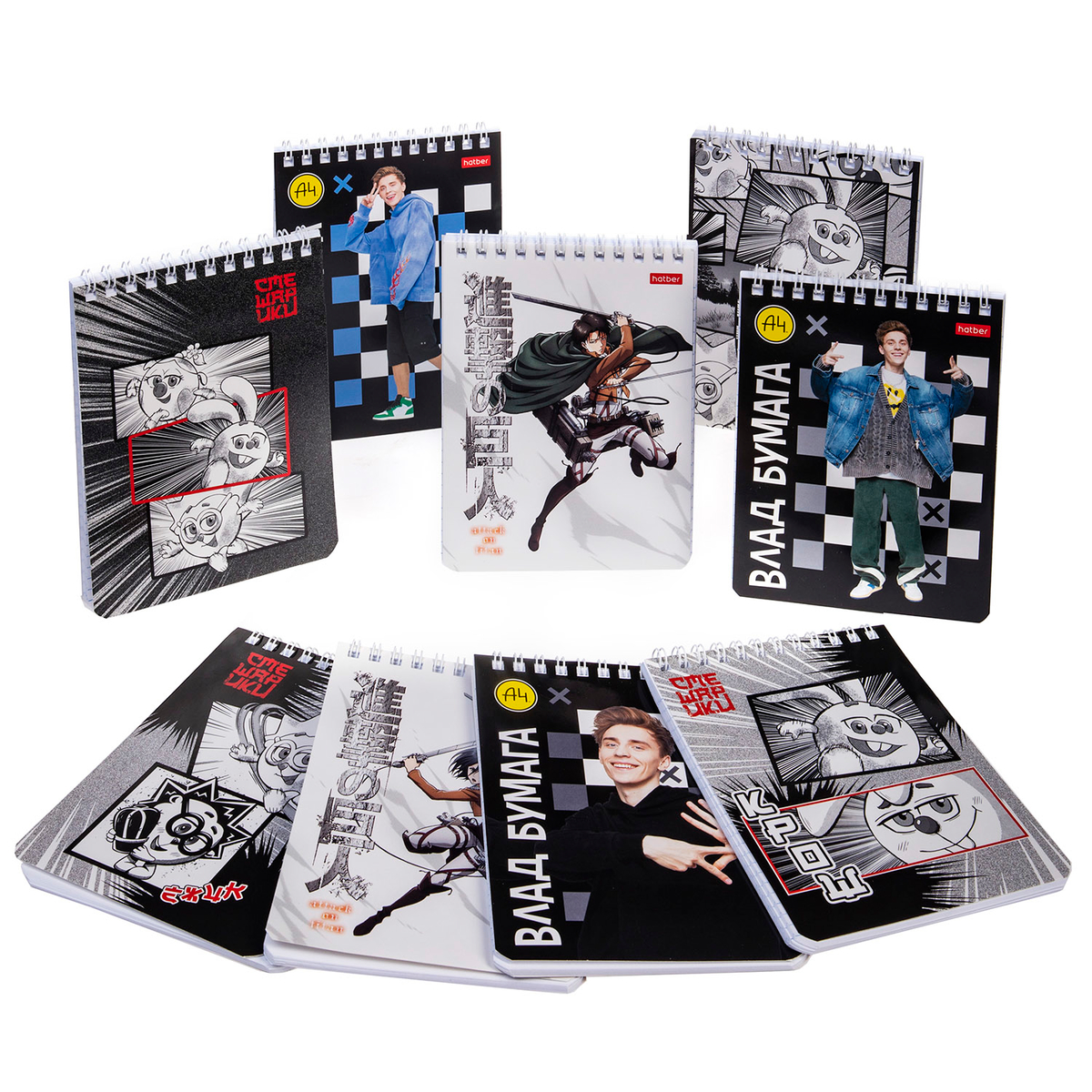 Представляем вам новые лицензионные блокноты А5-формата 40 листов на гребне в клетку. Популярные персонажи на обложках придают блокнотам стильный и яркий вид. Выбирайте тот, что ближе вам: стать частью бумажной команды с Владом А4, рассказать свои идеи повзрослевшим «Смешарикам» или поставить глобальные цели с атакой Титанов.