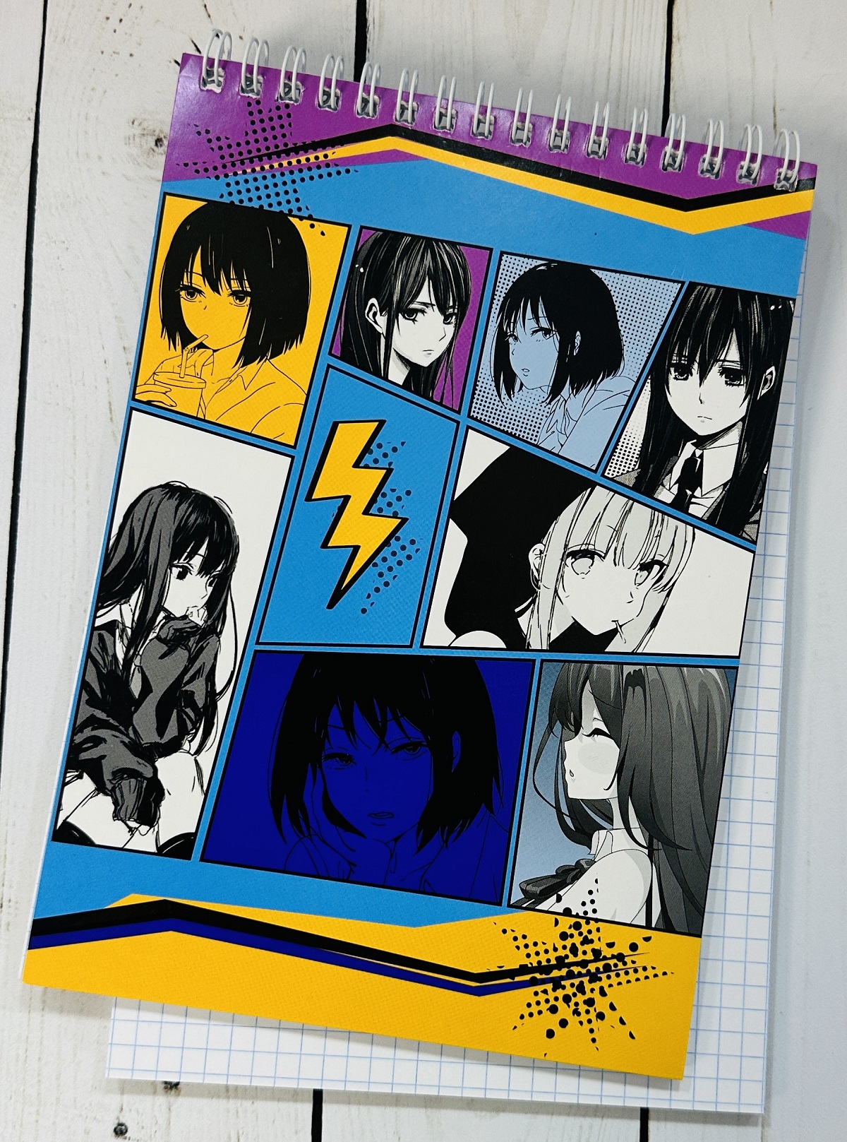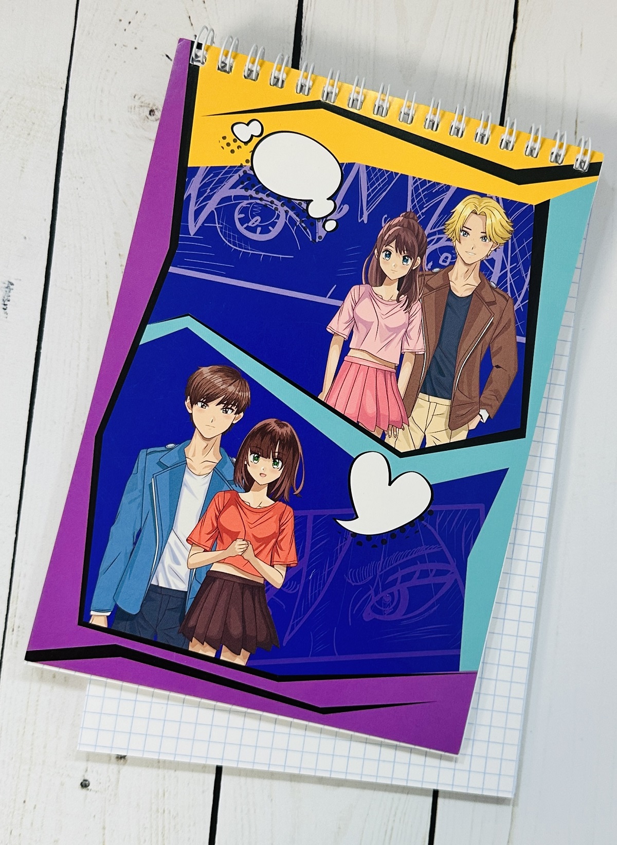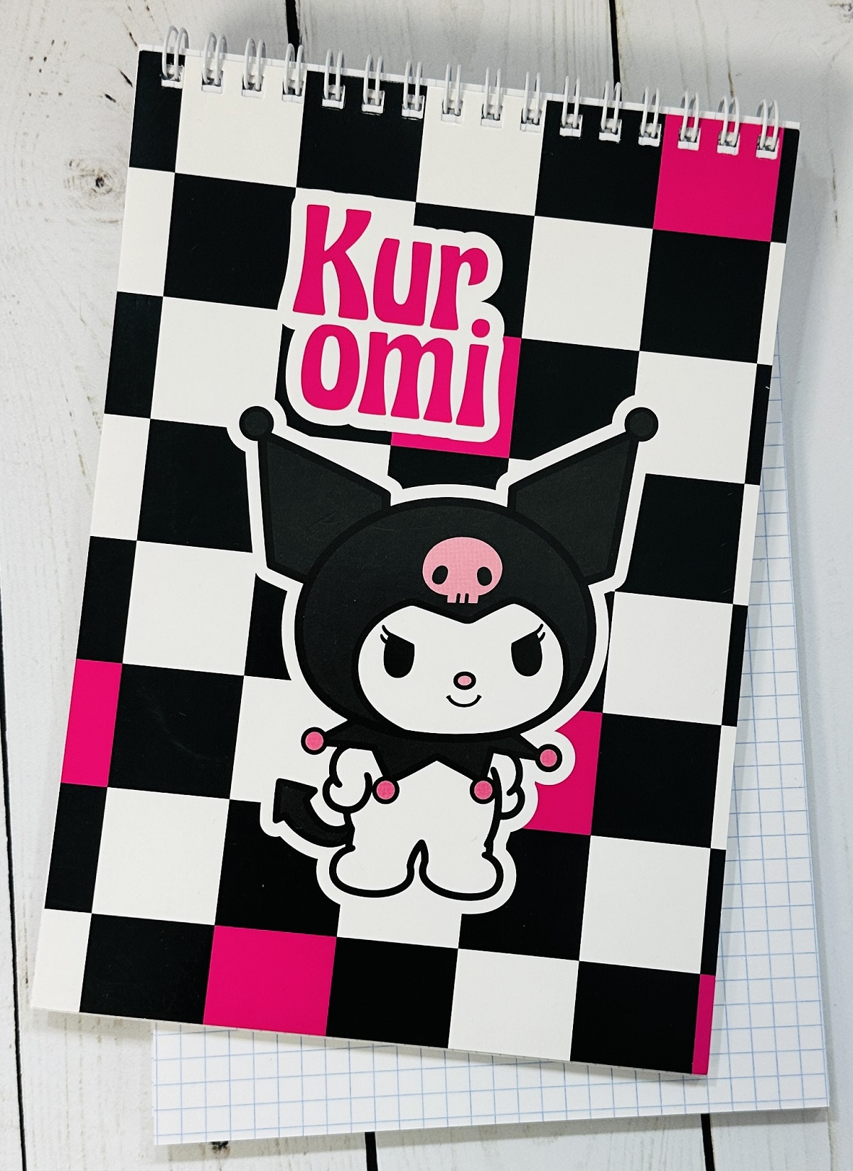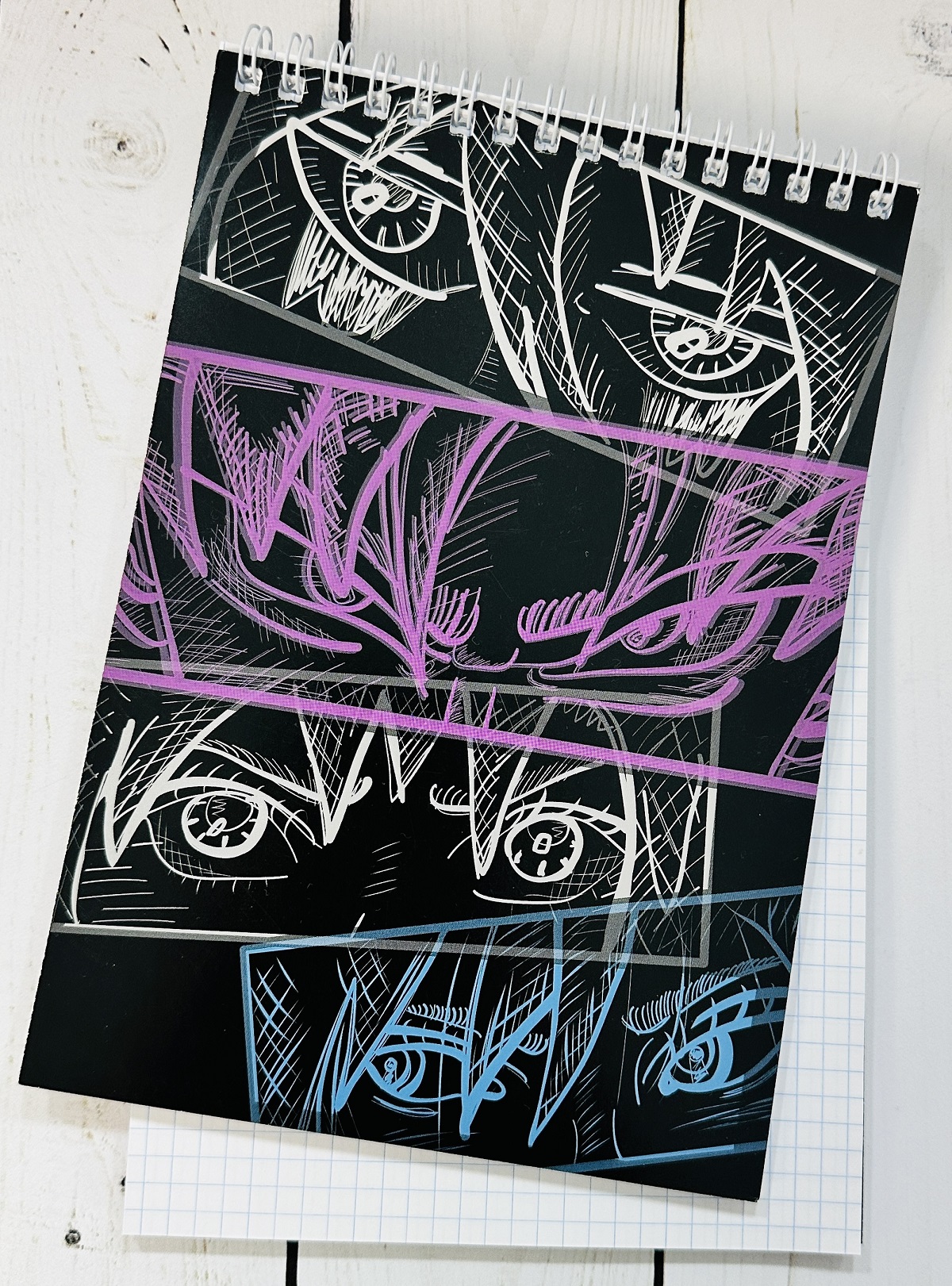 Внутренний блок с разлиновкой в клетку и картонная обложка скреплены с помощью металлического гребня. Высокое качество цветопередачи обеспечивает яркое и чёткое нанесение изображения. Размер — 140*201 мм. Объём — 60 листов.