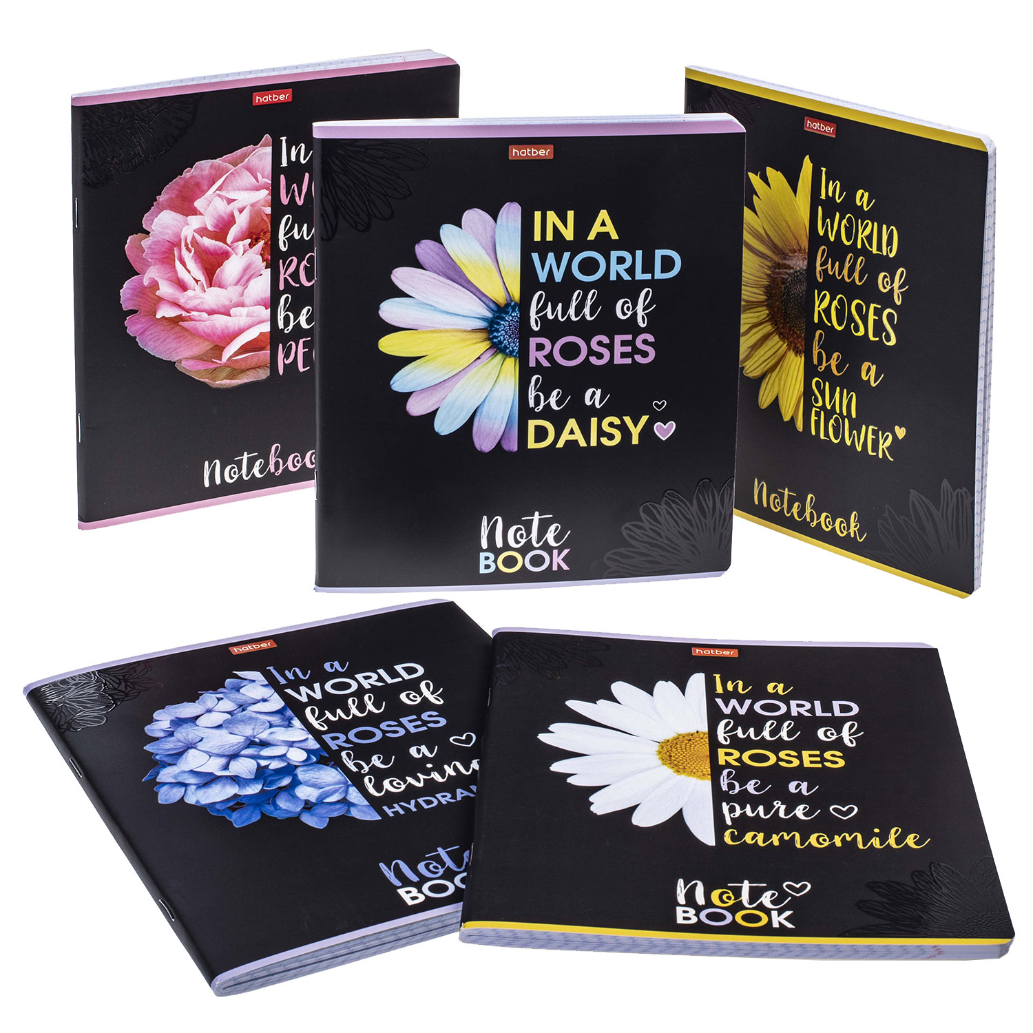 Новые тетради А5-формата 48 листов серии «Будь разной!» сразу бросаются в глаза нестандартным дизайнерским решением: чёрный матовый фон и яркие цветы, покрытые 3D-лаком. Пять дизайнов, пять цветов, пять обращений, направленных именно вам. Какой из этих цветов вы? А может, каждый день вы разная? Выделяйтесь среди роз, не бойтесь отличаться своей индивидуальностью!