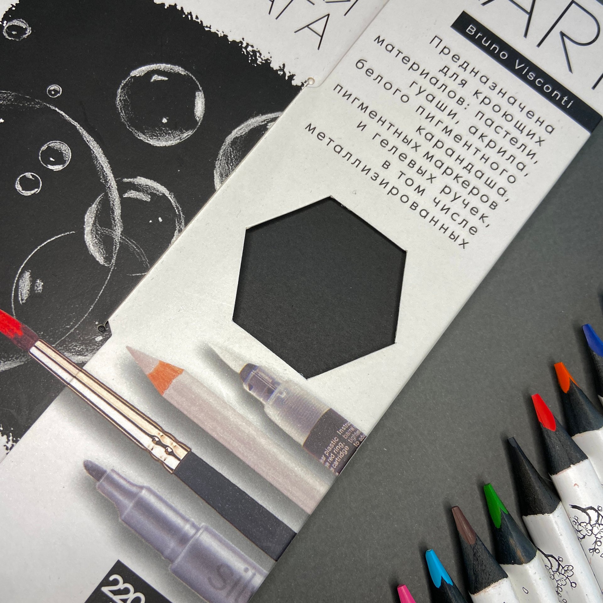 Чёрная бумага для скетчинга Sketch&Аrt плотностью 220 г/кв. м имеет разную фактуру с каждой стороны: гладкую и шероховатую. Это позволяет рисовать на ней различными кроющимися материалами: пастелью, гуашью, акрилом, белым пигментным карандашом, пигментными маркерами, гелевыми ручками, в том числе металлизированными.