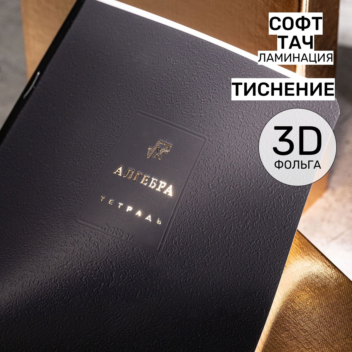 Бархатистый, глубокий чёрный фон с ламинацией софт тач, дополненный тиснением. Изысканная типографика: засечки, выверенность линий и толщины в каждой букве.