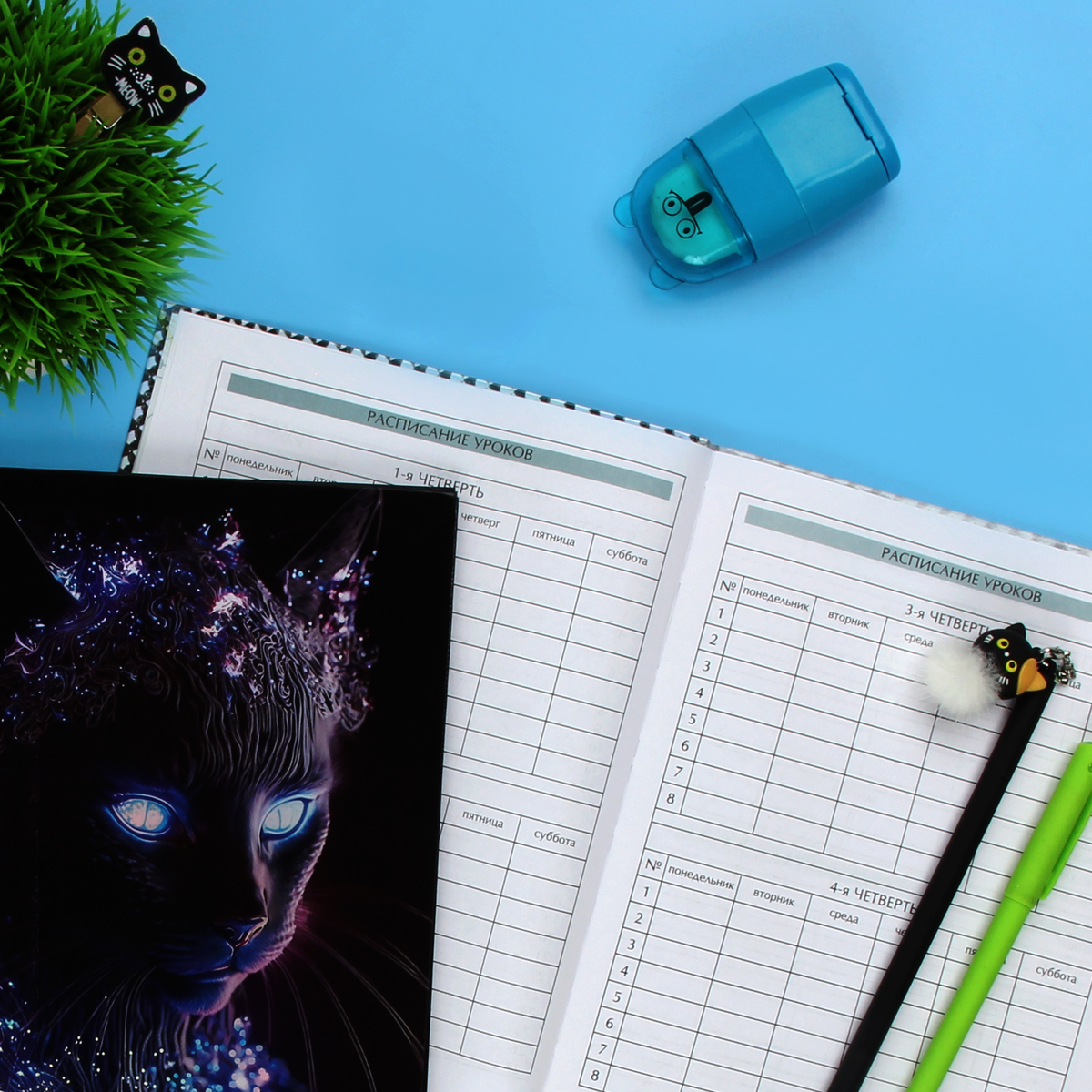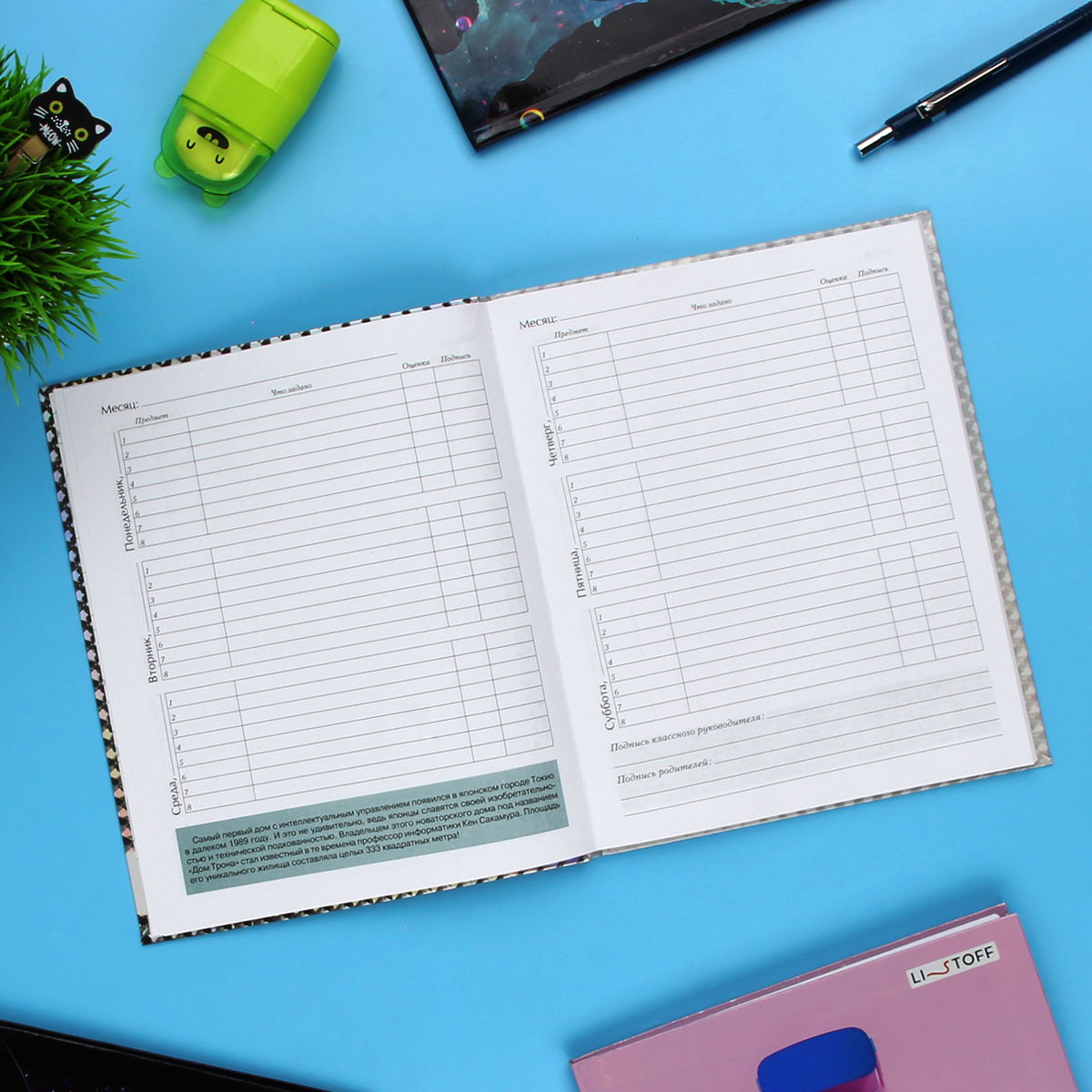 Внутренний блок дневника представлен 48 листами офсетной бумаги (60 г/кв. м) и двухкрасочной печатью. Также внутри комфортная сетка для записей домашнего задания, фиксирования оценок, сведения об успеваемости (20 предметов) и справочный материал на дополнительных листах, соответствует школьной программе средних и старших классов. Переплёт 7БЦ делает дневник удобным и прочным в использовании. А тематический дизайн на обложке дополнен эффектной голографической плёнкой.