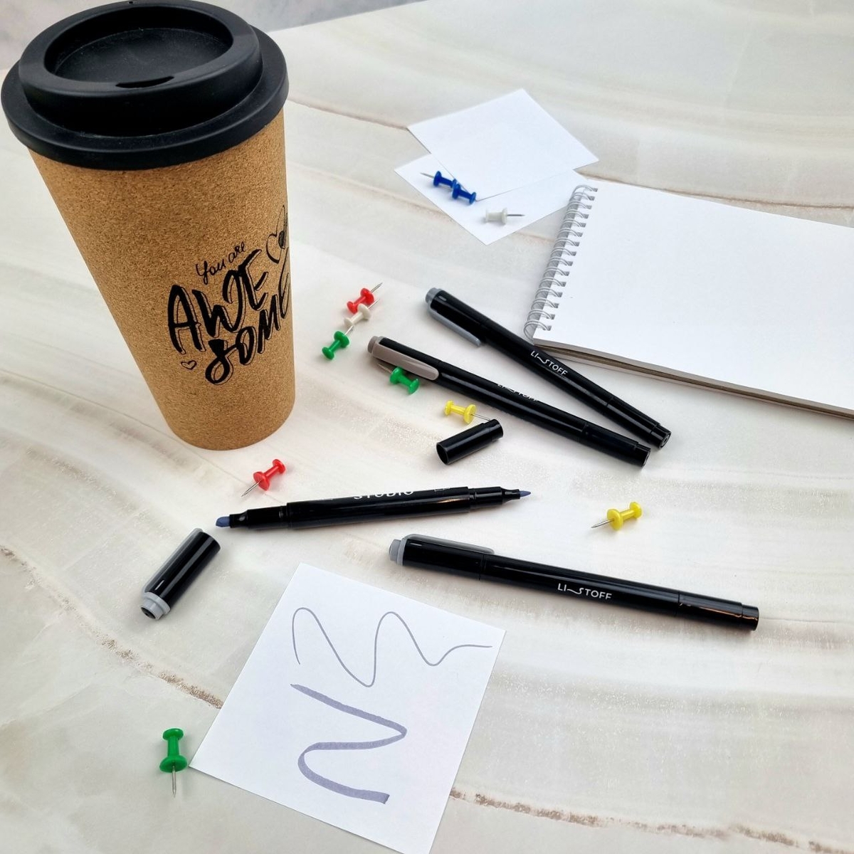 - Двухсторонние маркеры: с одной стороны тонкий пишущий узел для деталей, с другой — широкий для заливки.