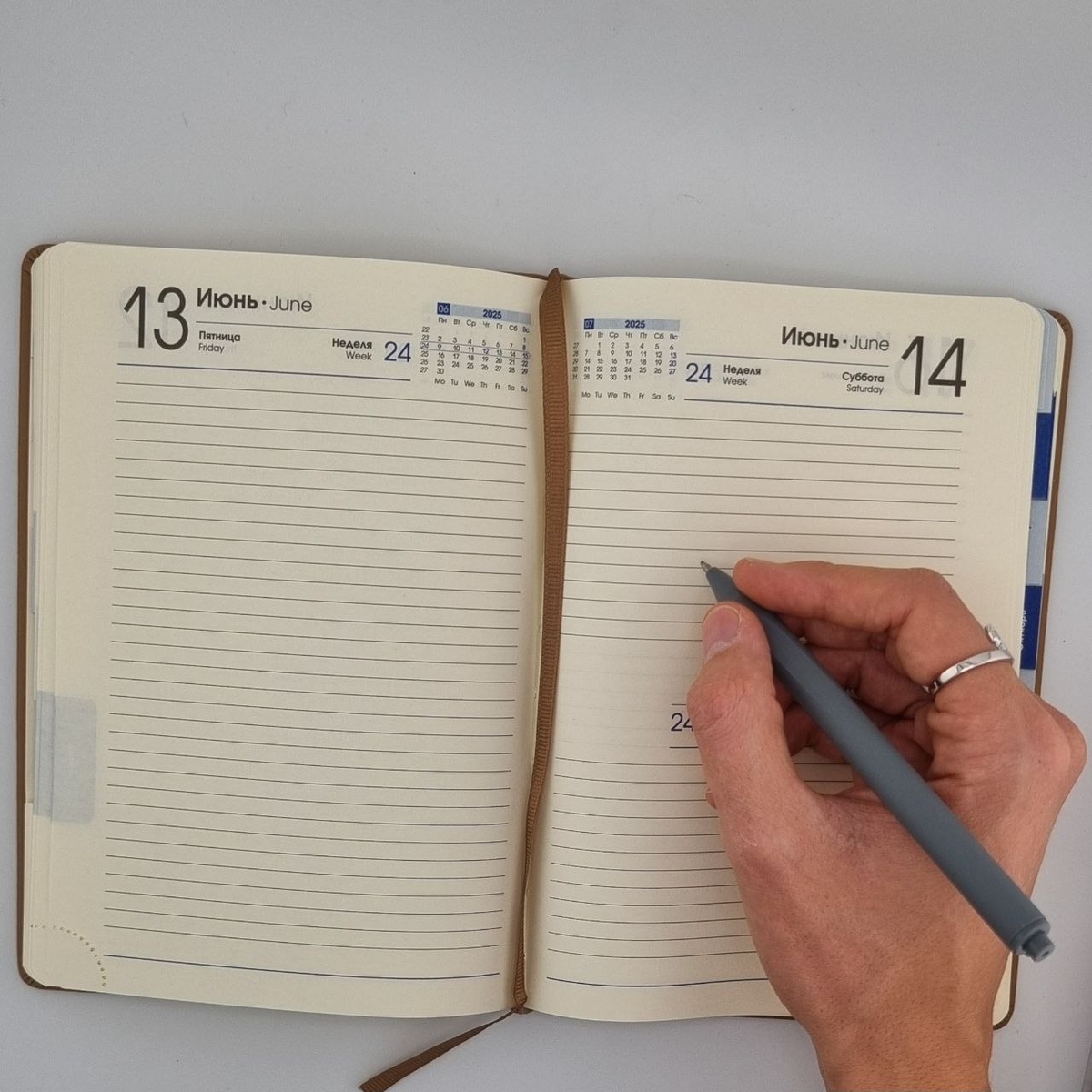 Обложка выполнена из премиальной искусственной кожи и имеет тактильно-приятное покрытие soft touch, поэтому вы не захотите выпускать ежедневник из рук.