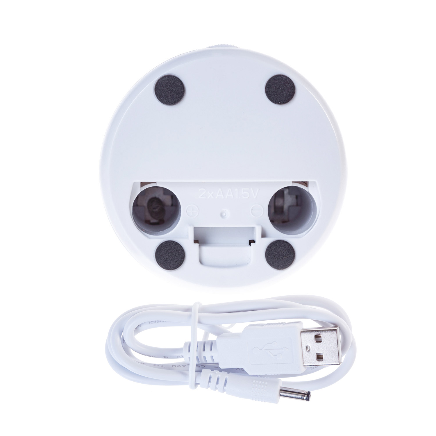 Имеет возможность двойного питания: может работать от двух элементов AA 1,5V (в комплект не входят) или от USB-зарядки смартфона.