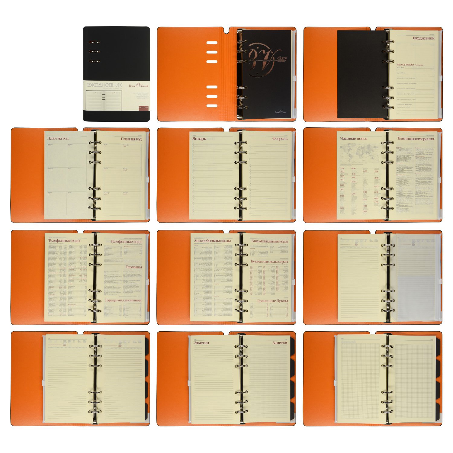 Это яркий и современный деловой аксессуар для долгосрочного использования. Внутри на металлических кольцах крепится сменный бумажный блок на 120 листов из качественной бежевой офсетной бумаги повышенной плотности. В ежедневнике содержится справочная информация на 25 страницах, которая будет у вас всегда под рукой.