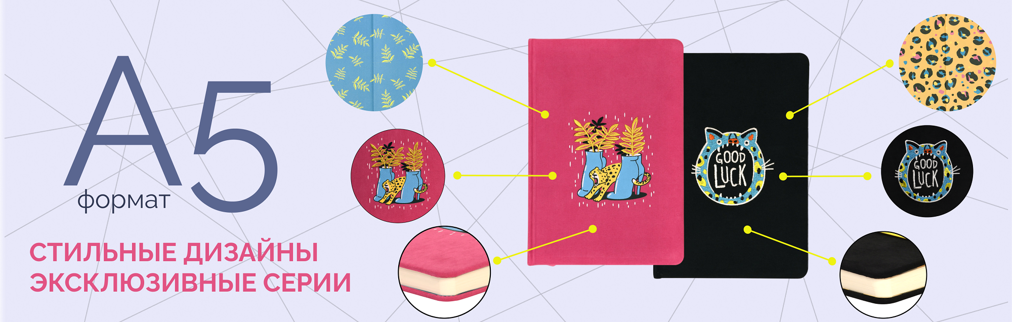 Жемчужины коллекции — ежедневники серий NEON MADNESS и EYE-POPPING с яркой и трендовой вышивкой. Твердую обложку украшает красочный амбалаж, а форзац и эрзац запечатаны стильным принтом.