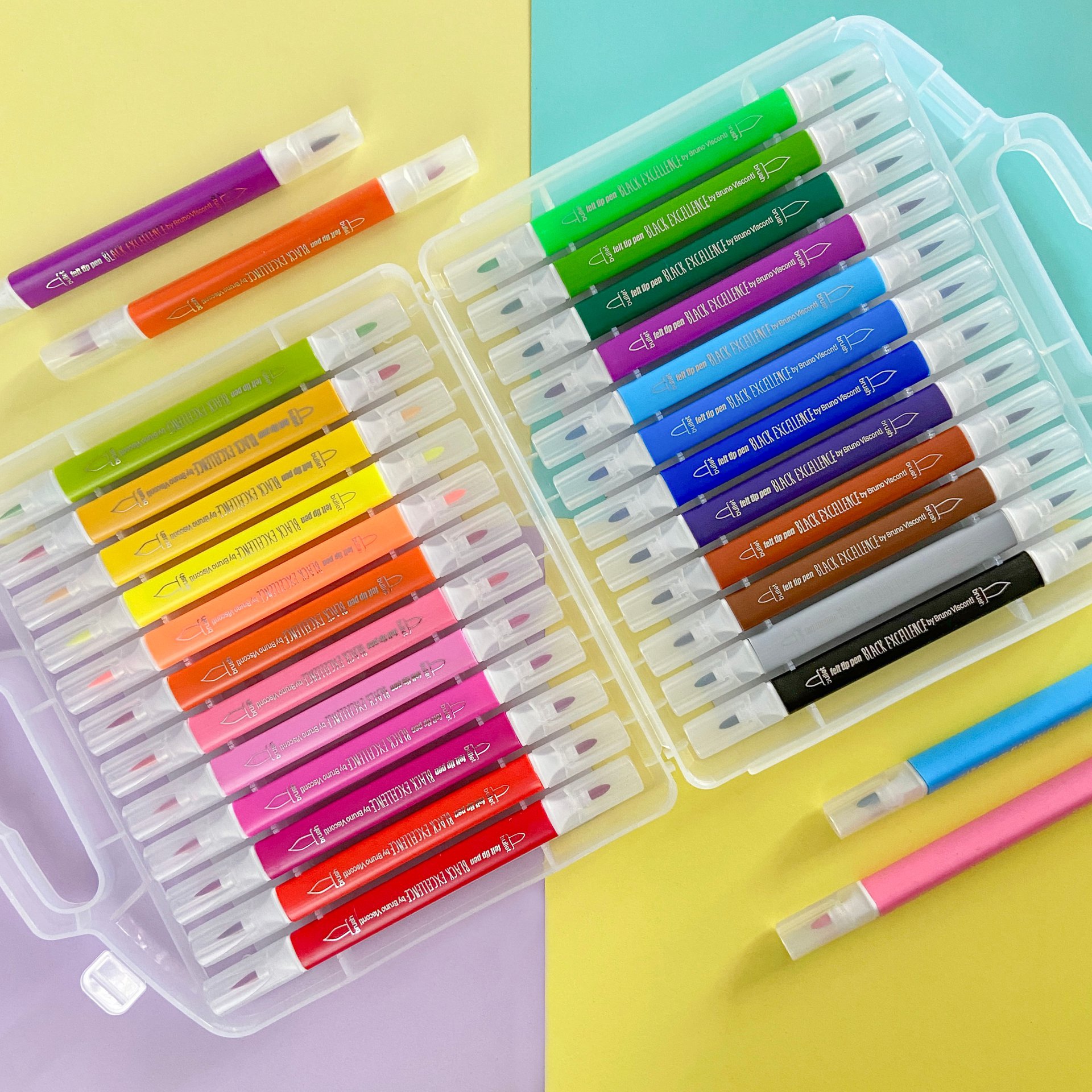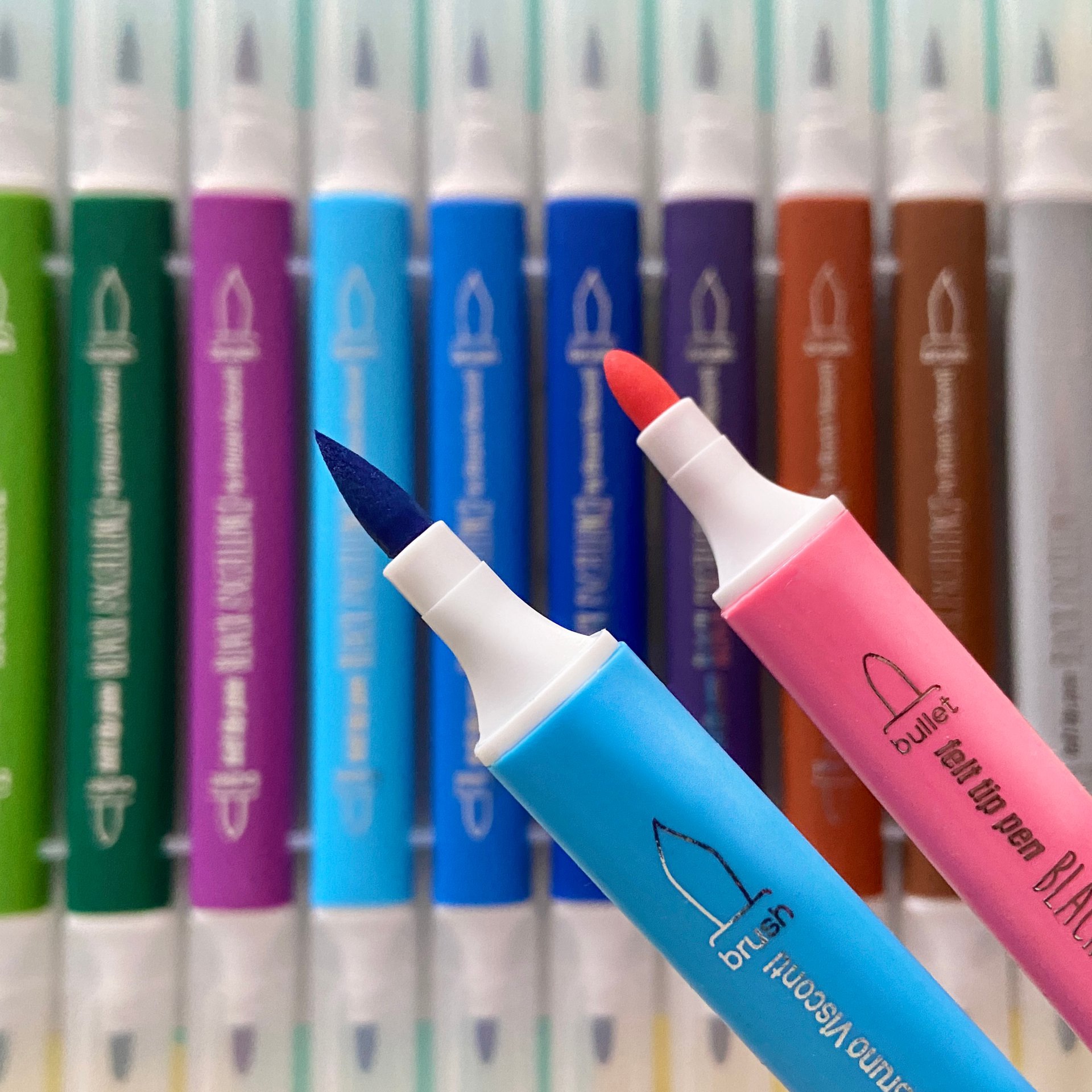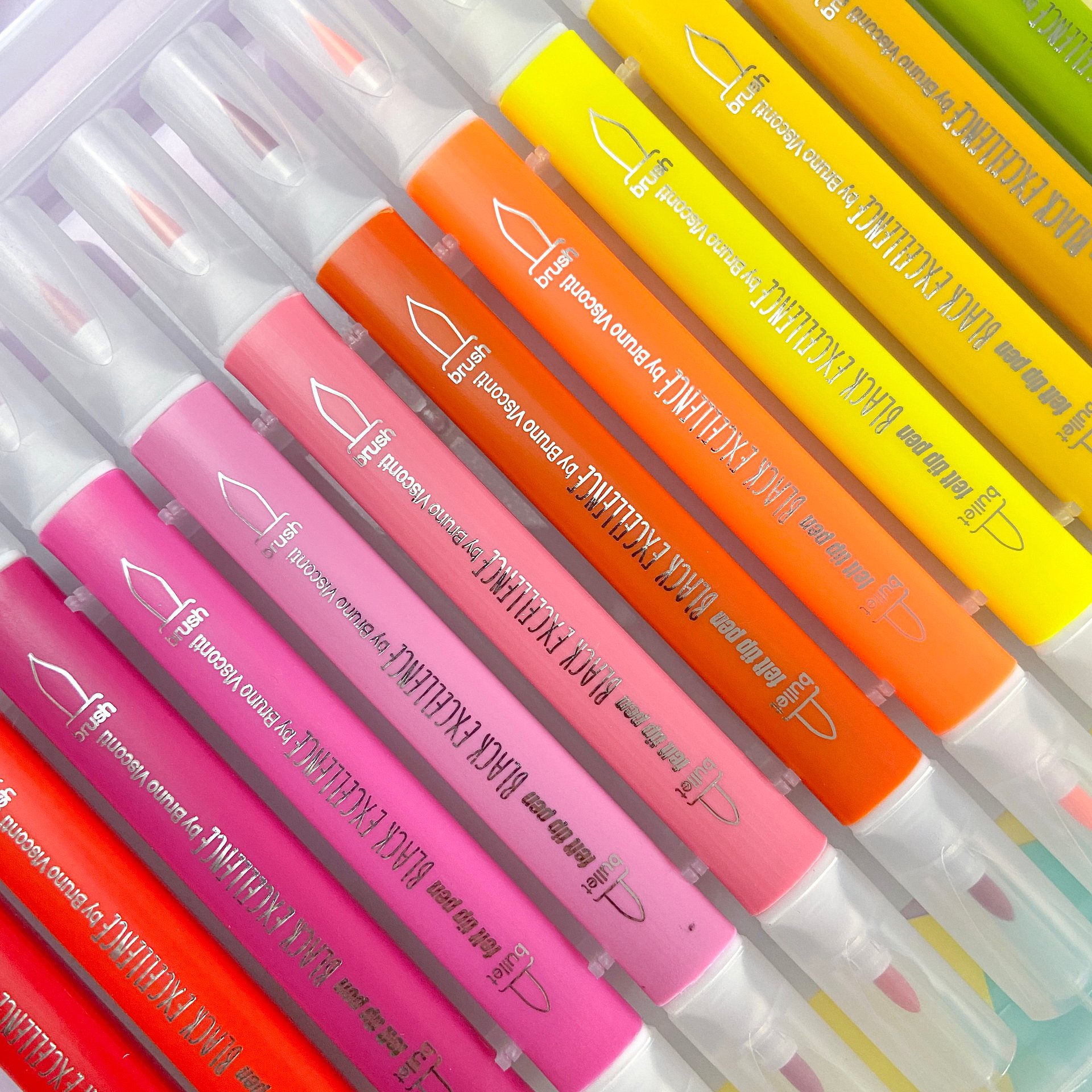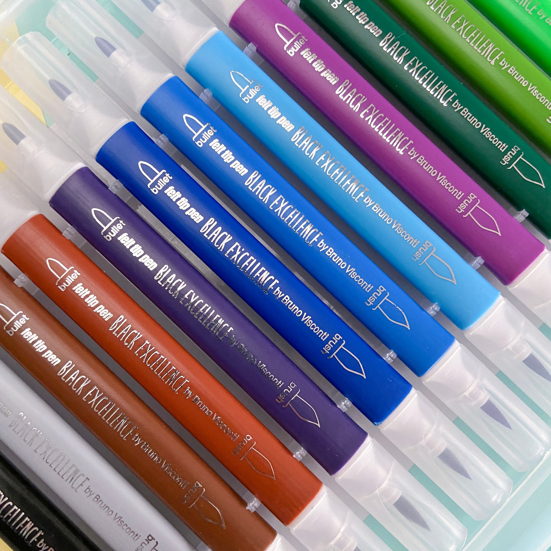 Многофункциональные фломастеры Black excellence выпускаются с двумя типами наконечников: пулевидным и кисточкой. Пулевидный предназначен для нанесения толстых линий, закрашивания рисунков большой площади. Гибкий кистеобразный наконечник идеален для нанесения тонких линий, лёгких, воздушных рисунков, орнаментов. Наконечники изготовлены из высококачественного синтетического волокна, поэтому прослужат долго и даже при сильном нажатии на фломастер не деформируются.