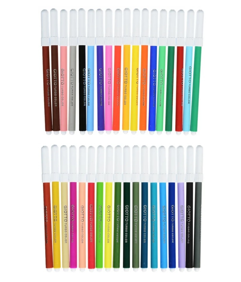 Фломастеры Giotto Turbo Color сделаны из натуральных красителей и не содержат вредных веществ. Фетровый наконечник надёжно зафиксирован и даже при сильных нажатиях не деформируется и не вдавливается, обеспечивая точность и комфорт при рисовании.