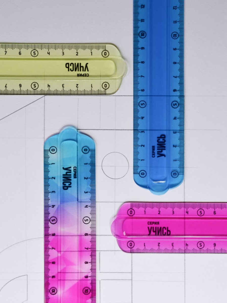 Линейки выпускаются в трех размерах: 15, 20 и 30 сантиметров. Также есть наборы из трёх предметов: линейка, транспортир, угольник.
