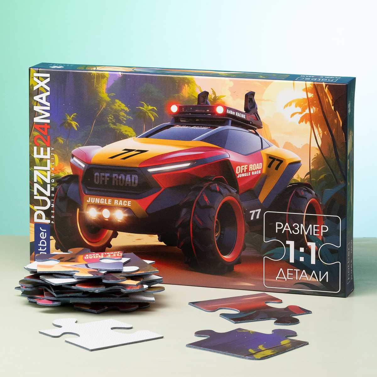 В «Гонках по джунглям» всё как в настоящем приключенческом фильме! Огромные колёса, яркие огни и мощный корпус внедорожника — всё это создаёт ощущение настоящего ралли в сердце джунглей. Ваш ребёнок сможет ощутить себя гонщиком, исследующим опасные повороты!